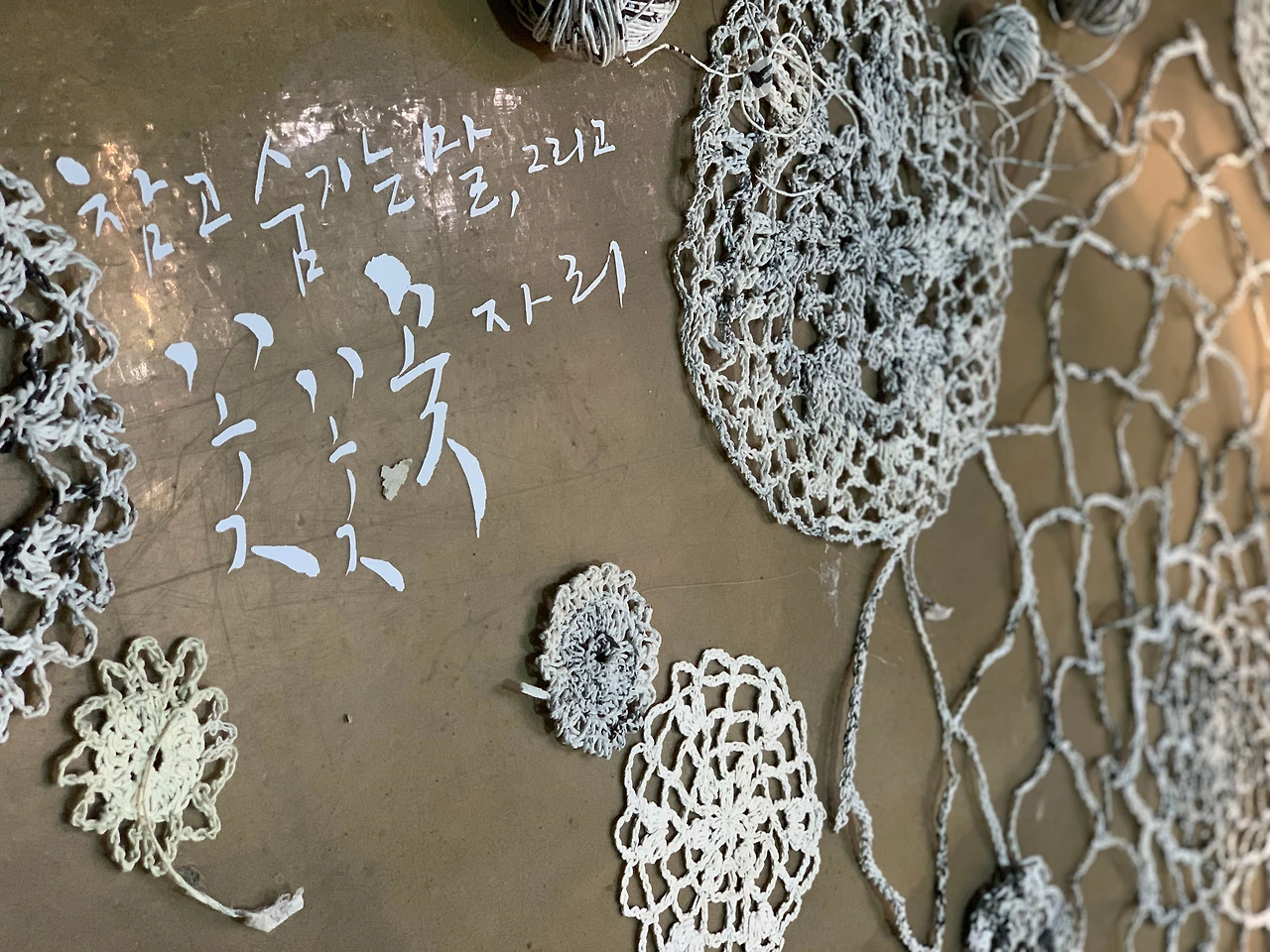 문제의식의 시작은 쓰기를 통해 재현된다. 그녀는 <여사서언해>를 긴 종이 띠에 가지런히 써내려 갔다. 습관처럼 이어지는 필사 행위는 엄마의 엄마가 그 딸의 딸에게 전승하는 규범의 내면화 과정을 그린 다큐멘터리와도 같다. 그런데 여자들이 실천해야 할 덕목을 새기는 이 의식적 기록에 반전이 숨어 있다. 문자로 강제하는 도덕의 항목을 한 행 한 행 뒤집고 비틀어보는 역설이 쓰기 그 자체에 내재되어 있는 것이다. 작가가 정서한 글자들은 오히려 자구字句의 강제력을 거부하는 힘을 지닌다. 또 오랜 쓰기의 노동 끝에 잘 말린 글자들을 말아서 꼬면, 더 이상 글자들이 지시하는 규범 따위는 사라지고 뜻 모를 얼룩무늬만 종이 끈 표면으로 스며 나온다. 그러면 읽을 수도 전승될 수도 없는 미덕 대신 평범한 삶의 이야기가 이 끈을 따라 새롭게 이어진다. <꽃밭 만들기>는 그렇게 문자가 강제하는 질서에 순응해야만 했던 세대의 희생을 쓰기를 통해 자각하고, 다시 여성의 가사 노동에 빗댄 수공예적 작업으로 그 부당함을 고발한다.