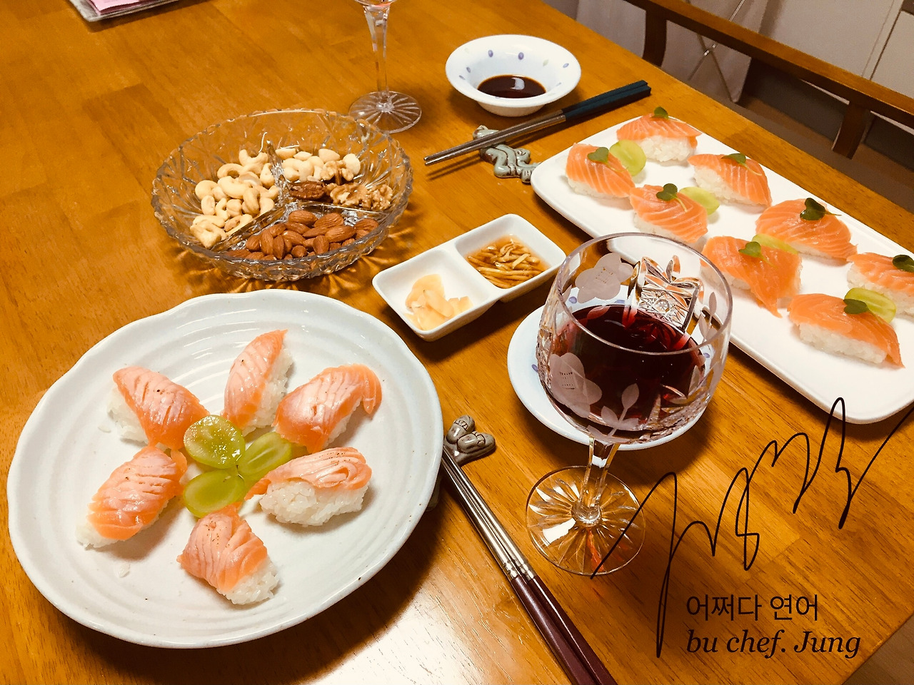 부산이 고향인 나는 생선을 그리 좋아하지 않는다. 조개 미역국보다는 소고기 미역국을 더 좋아한다. 하동서 올라온 시댁은 국도 생선국을 선호하고, 갓 캔 석화를 시켜 올려 가족들이 모여 앉아 까먹는 풍경은 무척 낯설었다. 그런 내가 좋아하는 생선요리가 있다. 초밥이다. 특히 생연어에 토치로 살짝 불향을 얹으면 그 맛이 일품이다. 다음 메뉴를 구상하고 있는 남편에게 넌지시 연어초밥을 던져 보았다. 전기밥솥에 쌀을 씻어 안친 후 ‘초밥’ 버튼을 누르고는 장바구니를 들고 나선다. 김 빼는 소리와 함께 고슬고슬한 밥이 완성될 때쯤 연어와 고추냉이를 담은 장바구니가 도착했다. 밥에 단촛물을 섞어 모양을 잡고 먼저 슬라이스 해 둔 연어를 얹어 불향을 더하니 여느 일식집 못지않은 식탁이 내 앞에 놓였다. 남편은 계획하지 않은 메뉴의 식탁을 <어쩌다 연어>라 이름 지었다.