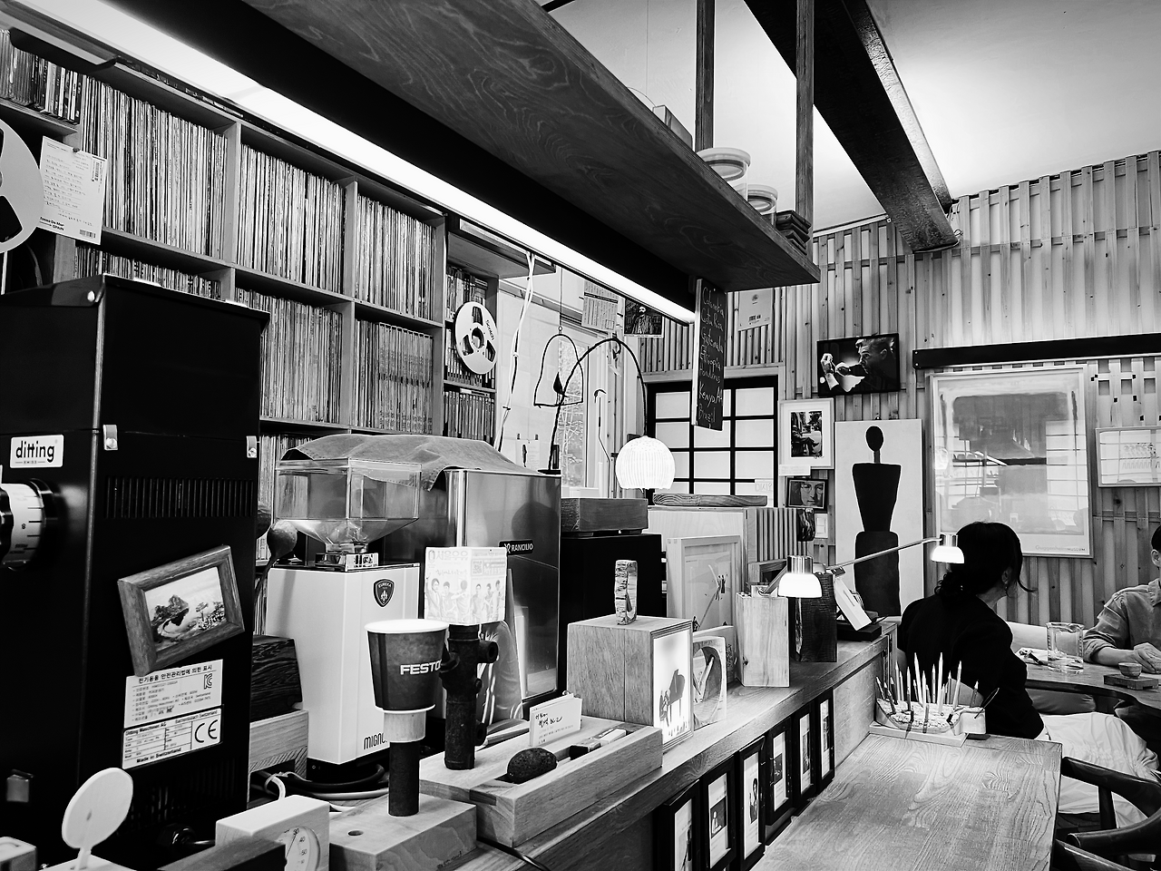 반면 집에는 없지만 커피숍에 있는 것들이 나를 또 커피숍으로 이끈다. 풍경이다. 풍경을 볼 수 있는 커피숍을 좋아한다. 화려한 도시보다는 자연이 보이는 풍경이 좋다. 언젠가 갔던 북카페의 소나무 뷰처럼 제주에 갈 때면 들르는 커피숍에서 보는 바다 풍경처럼 말이다. 풍경을 볼 수 없는 커피숍이라면 주인장의 취향이 묻어나는 커피숍을 찾아간다. 유행을 따라 힙한 커피숍도 좋지만, 조금 올드하거나 고집스럽더라도 주인장의 취향이 드러난 곳에 관심이 간다. 풍경과 취향이 있는 곳에 머물면 인생에 대해 한 수 배우는 기분이다. 광활한 풍경을 보며 내 일상의 고민이 얼마나 사사로운지 깨닫고, 취향이 잘 어우러진 공간을 보면 나도 나답게 살자고 다짐하게 된다.