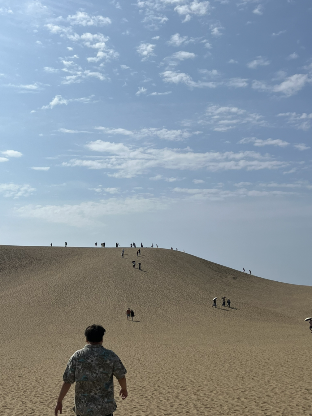 돗토리 사구에도 다녀왔다. 먼발치에서 언덕을 오르내리는 사람들이 자그맣게 보였다. 이 날씨에 저길 어떻게 가냐 싶었지만, 또 이때 아니면 언제 이렇게 걷나 싶더라. 주저하는 남편을 살살 꼬셔 걸었다. 위로는 해, 아래로는 모래로 뜨거웠다. 쉬엄쉬엄 땀을 뻘뻘 흘리며 걷다가 사진을 찍다 보니 어느새 언덕에 올랐고, 거기서만 볼 수 있는 바다를 한동안 멍하니 바라봤다. 올라오길 정말 잘했다 싶은 풍경이었다.