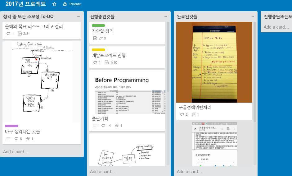 그리고 가장 좋은 점은 시작하지 못했거나 미완료, 드랍했던 내용을 몇 년이 지난 후에 다시보면서 새로운 방법을 찾을 수 있다는 점이다. 2~3년전에 드랍했거나 미완료한 카드들도 시간이 지남에 따라 "상황이 변했기에" 쉽게 완료할 수 있는 경우가 있기 때문이다. 그런 점에서 칸반관리법은 프로젝트 관리를 떠나 자신의 생각과 인생을 관리하는 방법으로도 쓸만하다.