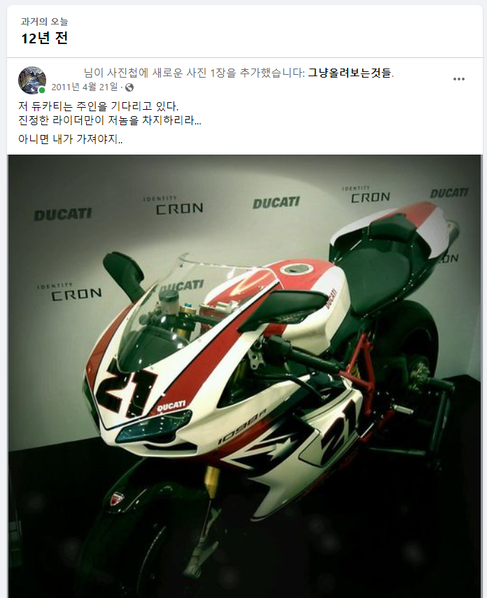 벌써 12년이 되었나? 나의 마지막 회사인 OOOO는 당시에 핫한 회사 중에 하나였다. 국내 최초의 안드로이드 태블릿으로 세계를 선도하겠다는 대표이사의 욕망은 하늘을 찔렀지만, 내부사정은 정말 아스트랄 그 자체였다. 내가 맡은 부서의 상위본부가 주관했던 행사에서 듀가티를 사은품으로 걸었었다. 그 때 정말 욕심났다. 퇴근할 때마다 1층 plaza에 있던 듀카티를 보면서 저걸 타고 퇴근해볼까?라는 욕망에 쌓이기도 했었다.