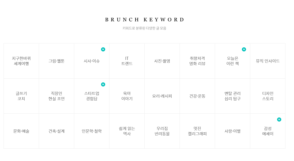 https://brunch.co.kr/의 하단에는 24개의 키워드(카타고리)가 존재한다.