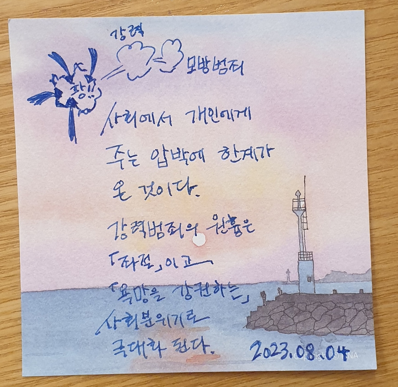 그들의 분노를 우리가 알기는 힘들다. 그렇지만 모방범죄가 유행처럼 한 순간에 일어나는 것으로 그들의 분노수준을 상상할 수 있다. 국뽕에 취해 우리의 치부를 보지 못하는 바보짓을 하면 안된다고 본다. 병든 사회를 고칠 골든타임이 있는지 조차 모르겠으나 병듦을 자각하지 못한다면 결과는 암울함 뿐이다.