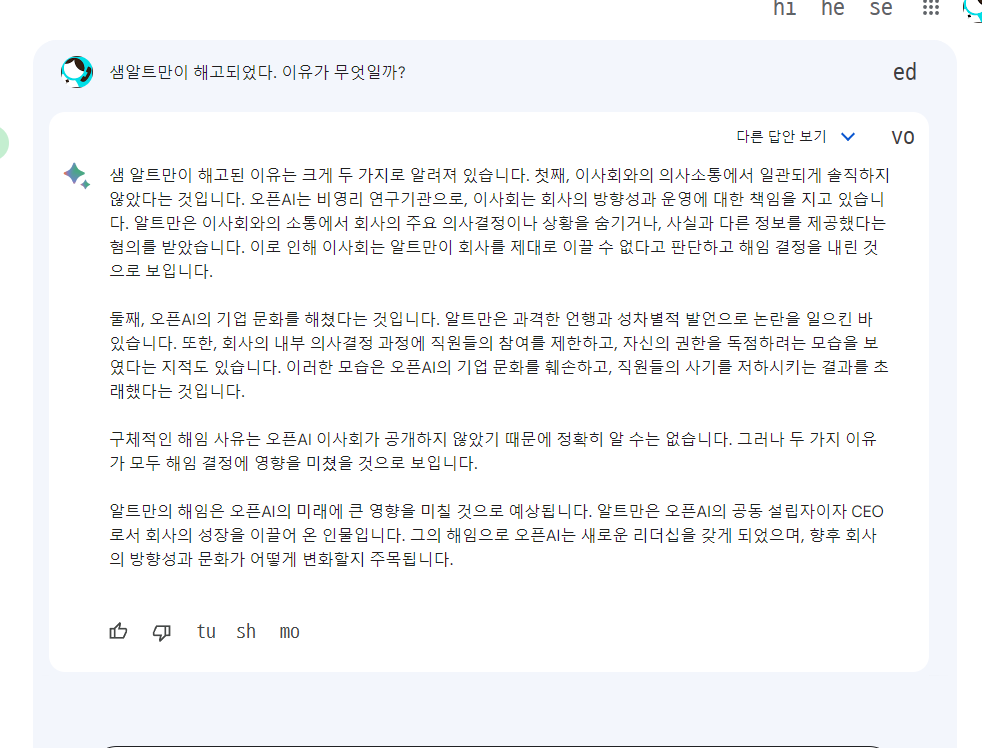 며칠 전까지 OpenAI의 개발자의 날(Dev day)에 피칭했던 사람이 한 순간에 해고되었다고? 그리고 그 짧은 기간동안 의아했던 발표들은 무엇이었지?라는 생각을 할 수 밖에 없었다. 그래서 다른 생성 AI에게 샘 알트만의 해고소식에 대해 프롬프트를 던졌다.
