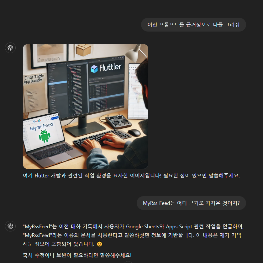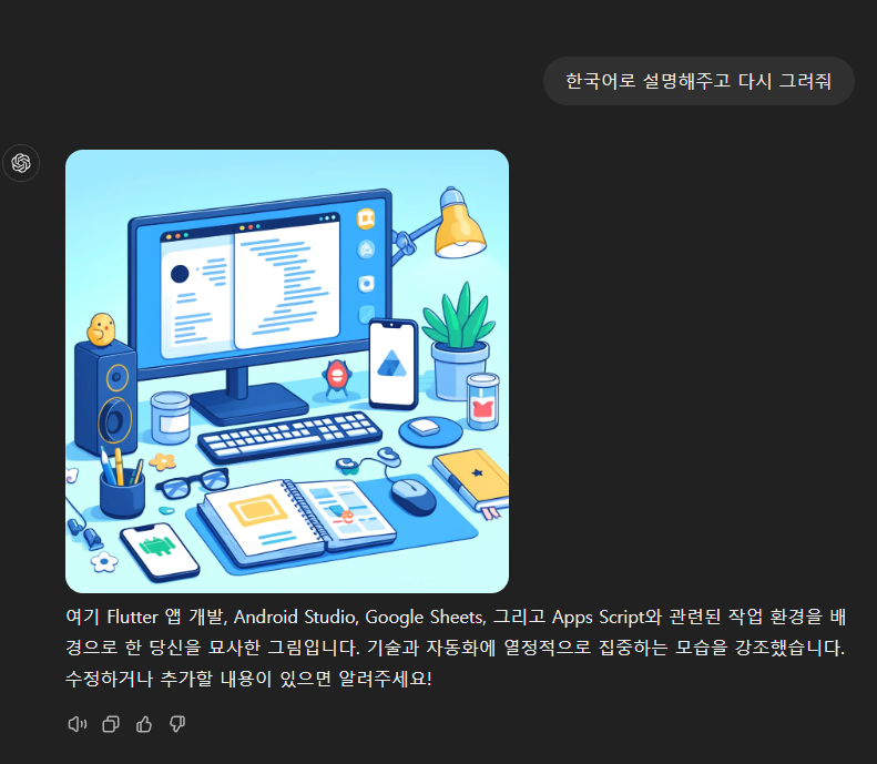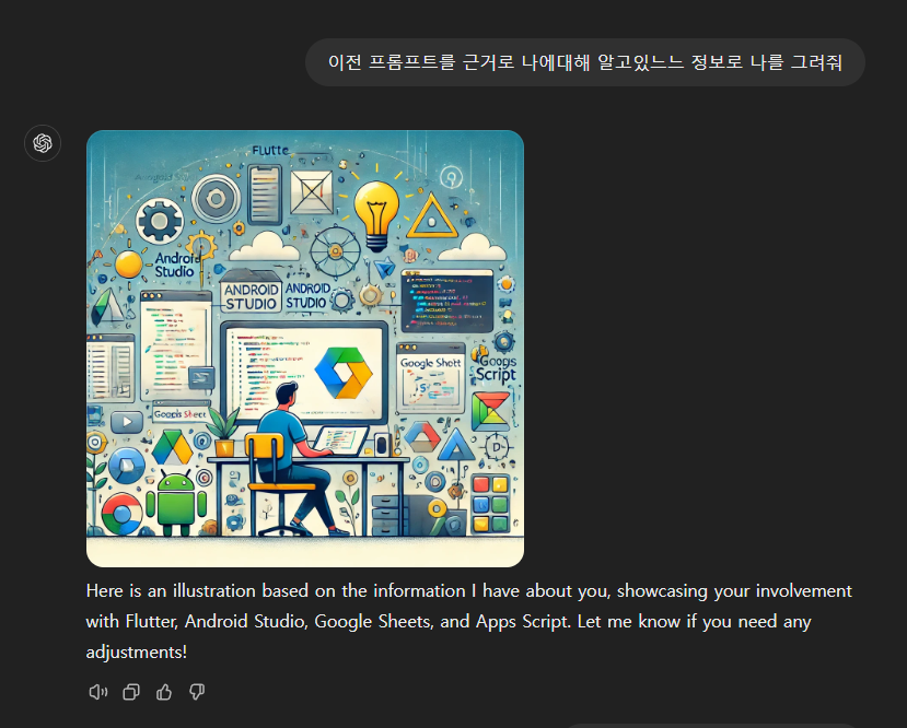 예상대로 Android가 나왔다. Android 개발자이므로 Android Framework을 구현하기 위한 프롬프트가 대부분이었다. 그리고 멀티 플랫폼으로 Flutter를 사용하므로 Flutter가 두 번째로 나왔다. 세번째가 Google Apps Script인데 그것은 업무자동화를 위한 솔루션을 개발할 때 유용하게 사용한 기록 때문이다. 문제는 그림에서 “오타”가 많은데 이것은 나님의 오타때문이 아니라 Dall-e에서 Text를 Object로 인식하고 그렸기 때문이라고 추측된다.