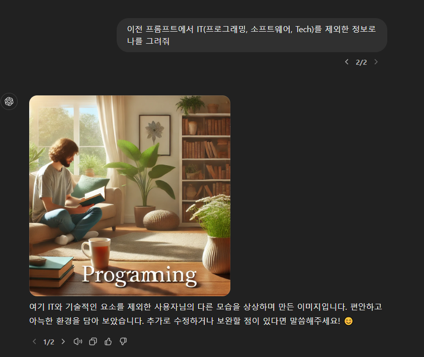 마지막 이미지는 조금 충격을 받았다. 어떻게 내 헤어스타일을 알았지? 그리고 내가 평소 저런 식으로 독서환경을 만든다는 것을 어떻게 안 것일까? 라는 망상에 접하게 되었다. 어떤 논리로도 저런 이미지가 생성될 근거는 없었지만, 싱크로율이 70%이상 일치한다. 특히 드레스코드는 100% 유사하다(사실 개발자 옷이 다 그 따위이긴 하다. 프롬프트상 개발자만 사용하는 코드를 사용했으니 대충 때려 맞추었을 것이다).