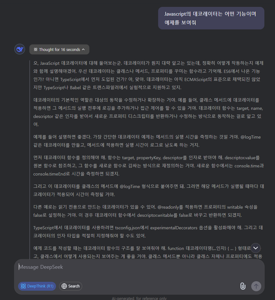 DeepThink (R1)이라는 버튼을 선택 후, 프롬프트를 진행하면 추론(?)의 과정을 문장으로 만들어준다. 기존의 생성AI들은 아웃라인 글쓰기 형태(개인적으로 가장 완벽한 글쓰기라고 생각한다)이지만 추론의 과정을 Tracing하는 문장을 먼저 보여줌으로써 읽는 사람들의 사고의 폭을 넓힐 수 있어서 좋았다.