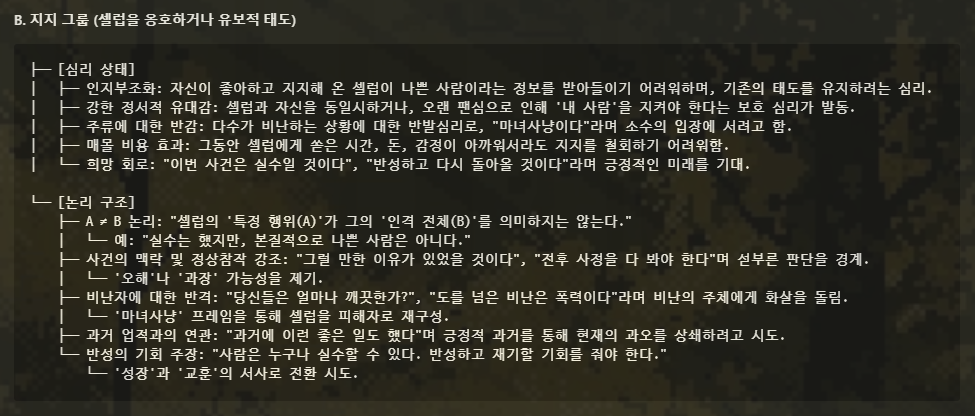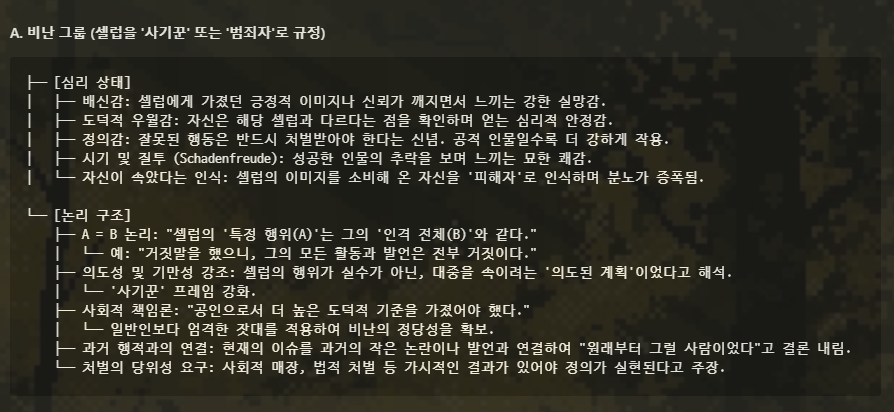 정리하자면 배신감 때문에 안티세력으로 돌아선 사람들이 있을 수 있다. 아니면 정의감이나 도덕적 우월감을 과시하기 위해서 “자기 브랜딩”을 위해 셀럽을 공격하는 사람들도 있을 수 있다. 그런데 2개의 심리상태를 셀럽에게 가져본 경우가 없다(준거집단이라면 다르겠지만). 반면, [시기와 질투 또는 피해자]라면 어느정도 이해가 된다. 사는 것이 힘들다보니 “남의 일에서 나의 경험을 투영하고 싶은 경우”가 있기는 했다.