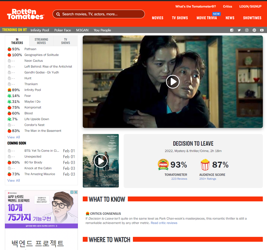 며칠 전 오스카에서 헤어질 결심을 선정하지 않았다고 엄청난 비난의 기사들이 나왔다. 물론 국내기사 밖에 보지 못했기에 정확한 내용은 알지 못한다. 그러나 로튼토마토의 넘사벽 점수를 보면 해외도 다르지는 않을 것으로 추측할 뿐이다.