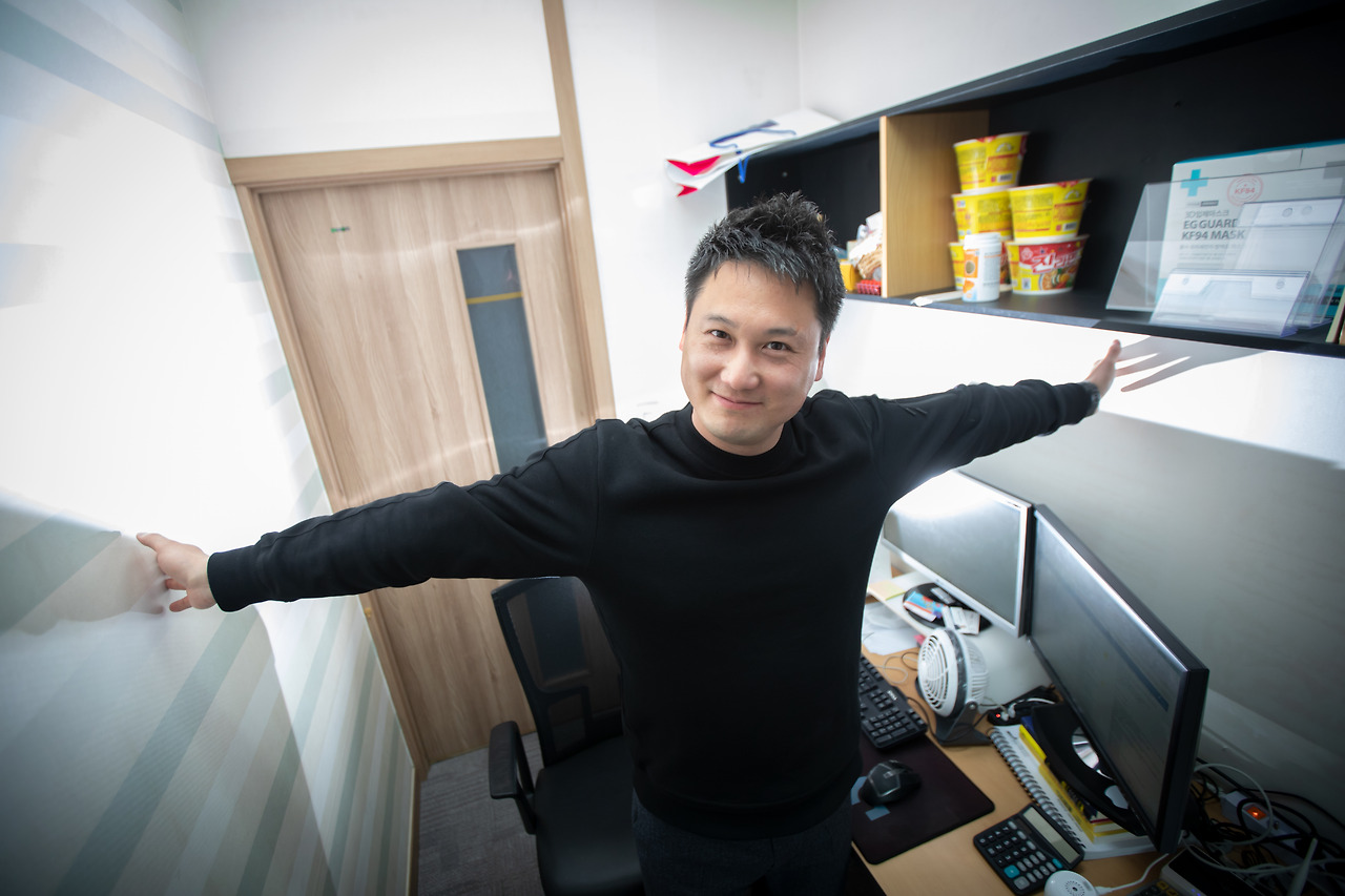 책상 하나와 컴퓨터 두 대가 전부인데 금붕어 밥이라니... 참 어울리지 않는 물건이다. “아 이거요? 점심 먹고 산책을 하는데 산책길에 잉어가 있는 연못이 있더라고요. 들고 가서 매일 밥 주고 있어요.”