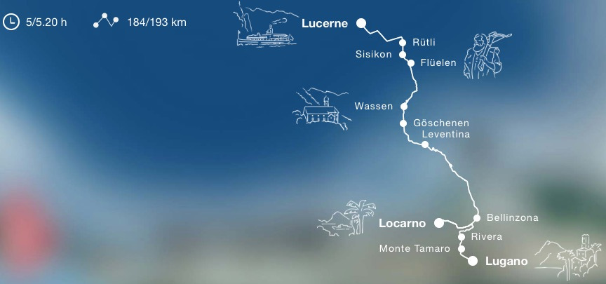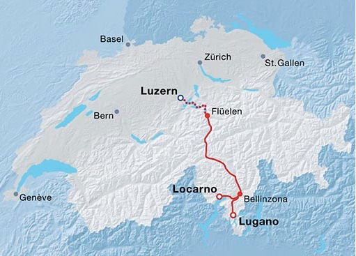 루체른에서 출발하는 빌헬름텔 특급은 루체른에서 플뤼엘렌까지는 유람선으로 이동하고 플뤼엘렌에서 루가노까지는 열차를 이용한다. 종착역이 루가노와 로카르노 2개 노선이 있기 때문에 중간에 벨린쪼나에서 내려 로카르노행 열차와 루가노행 열차를 선택해서 타야 한다.