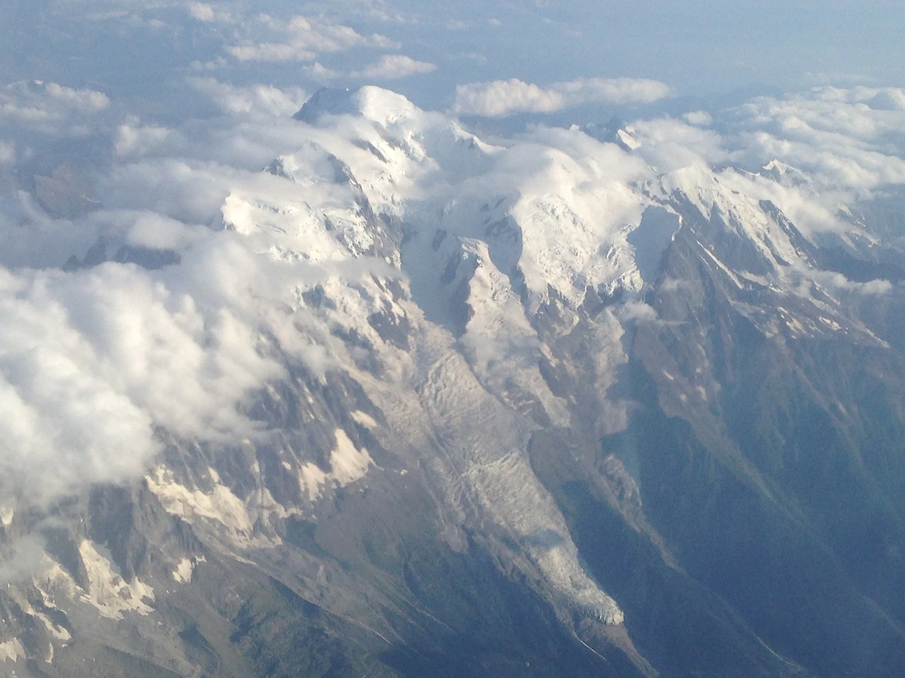 비행기를 타고 가며 가장 경이로웠던 모습은 바로 발밑에 있는 듯한 모습으로 나타난 몽블랑이었다. 마치 유럽 최고봉은 나라는 듯이 다른 산들을 압도하는 높이를 자랑하며 보솜 빙하와 함께 눈앞에 나타났다. 샤모니에서 올랐을 때는 이렇게 높은 줄 몰랐는데 비행기에서 이렇게 가까이 보이는 걸 보니 엄청난 높이가 실감이 났다.