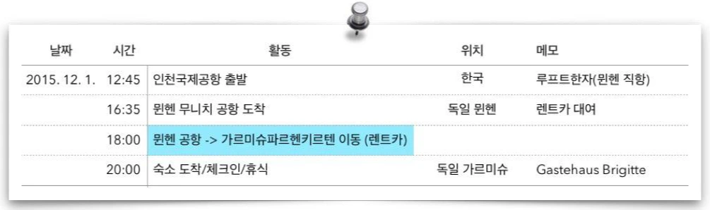 뮌헨 공항에서 가르미슈파르텐키르헨까지는 차로 약 2시간 정도 소요된다. 여느 대도시와 마찬가지로 복잡한 뮌헨 시내에서 잠깐 헤매긴 했지만 뮌헨을 벗어나 고속도로 위를 한참을 달리니 이번엔 오히려 너무 한적해서 긴장이 되었다. 가로등도 없는 깜깜한 고속도로를 달려 가르미슈의 숙소에 도착하니 그제야 긴장이 풀리며 피로가 한꺼번에 밀려오는 듯했다. 이미 마을은 문을 연 곳을 찾기가 힘들었고 우리도 다음날의 일정을 위해 일찍 휴식을 취했다.