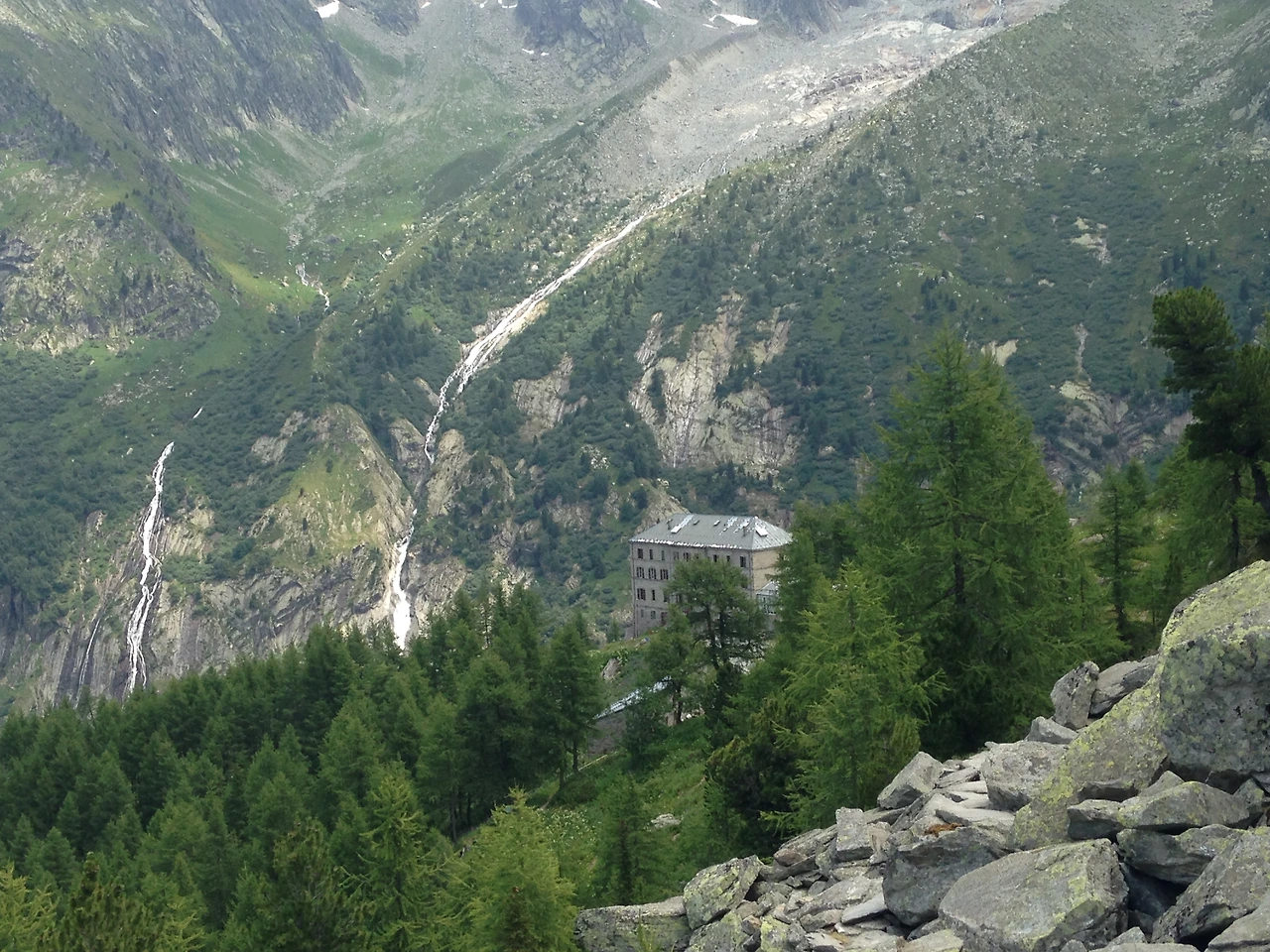눈에 보이는 능선을 넘어가니 몽탕베르에 가까이 왔음을 알리는 폭포와 함께 호텔이 보였다.