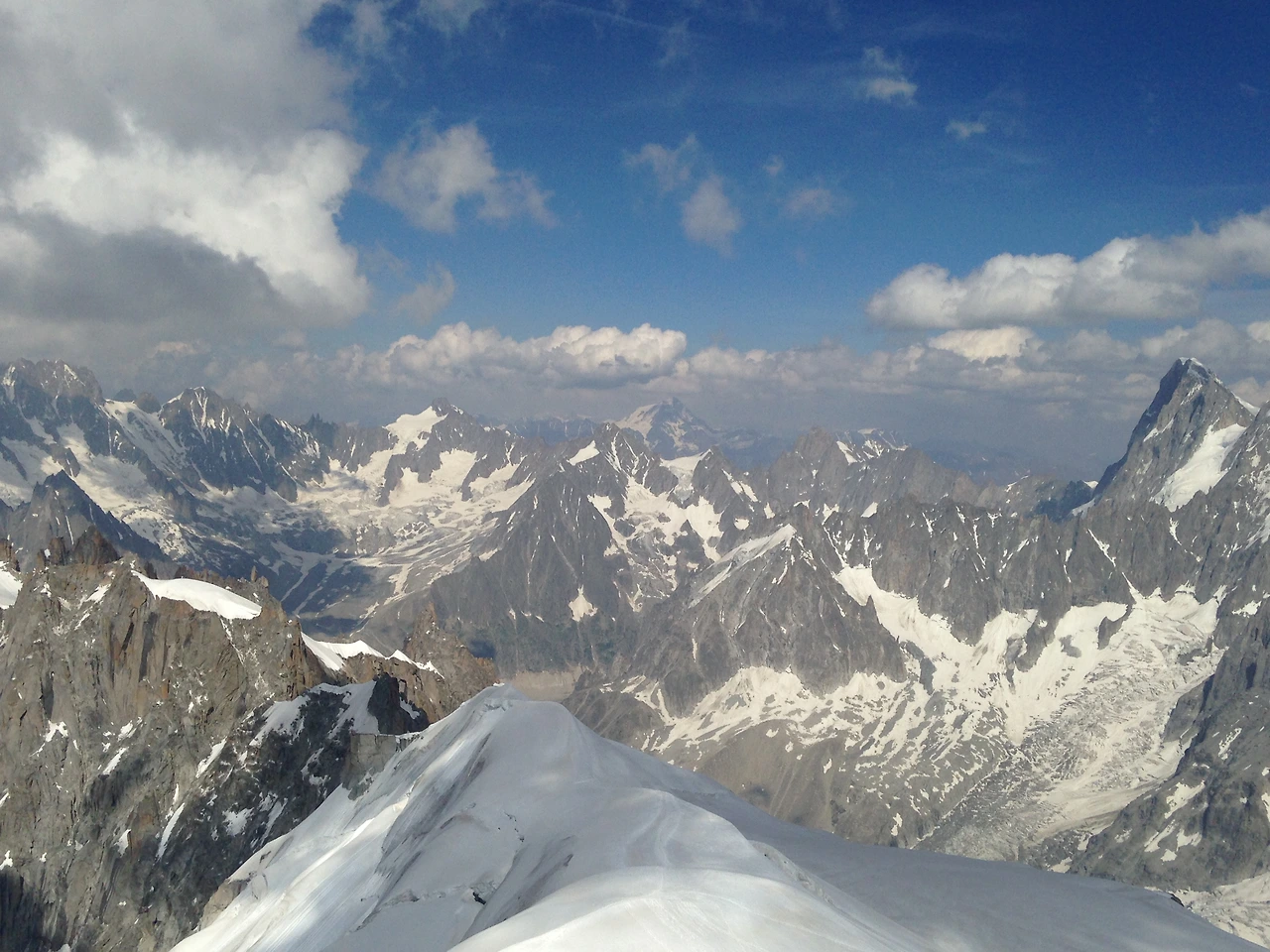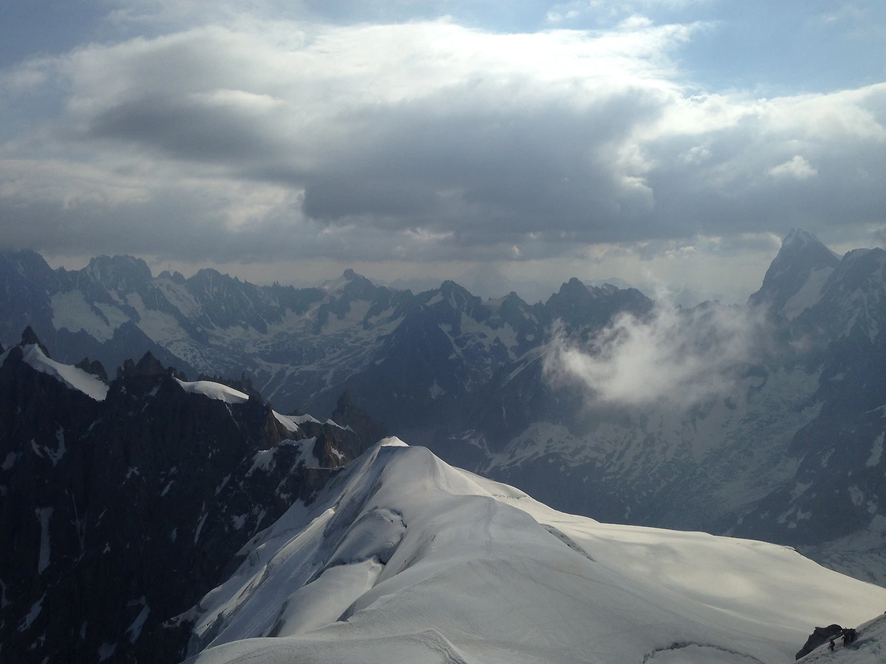 몽블랑을 등지고 반대편을 돌아보면 알프스 침봉들이 멋진 장관을 연출하며 눈앞에 펼쳐진다. 아침엔 구름이 걷히지 않아 조금 흐린 모습이다. 이 역시 오후에 다시 올라 맑은 하늘과 함께 보니 더욱 장관이다.