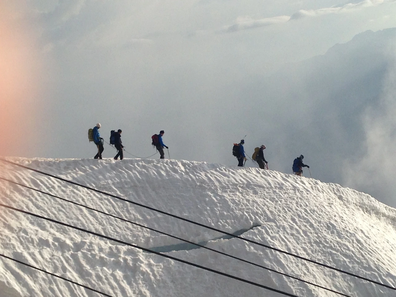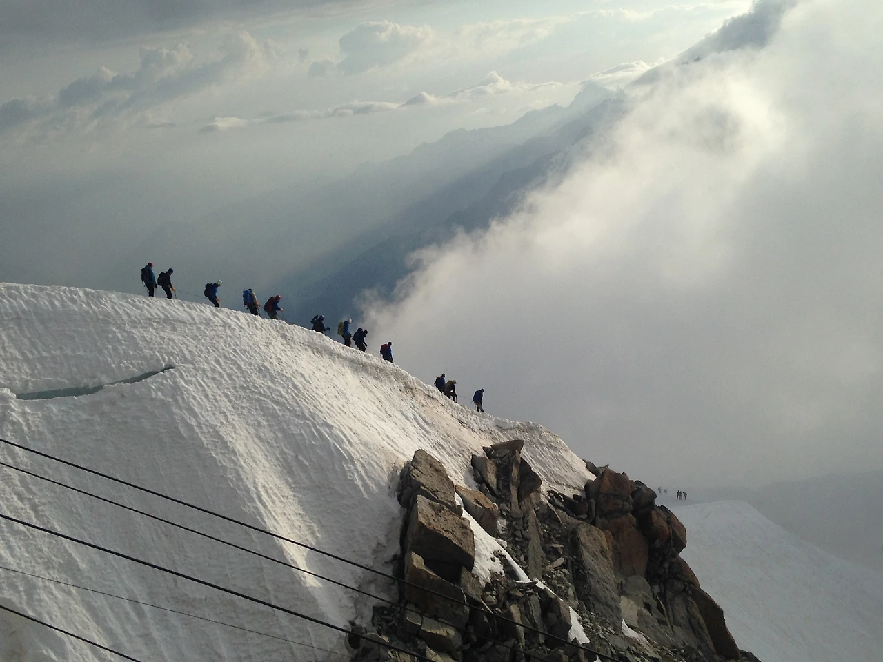 다시 눈을 돌리면 몽블랑을 등반하는 사람들이 눈에 보인다. 자세히 보면 위험상황에 대비하기 위해 서로를 끈으로 연결하고 이동한다. 위험할 듯한데도 생각보다 많은 사람들이 도전하는 듯했다.