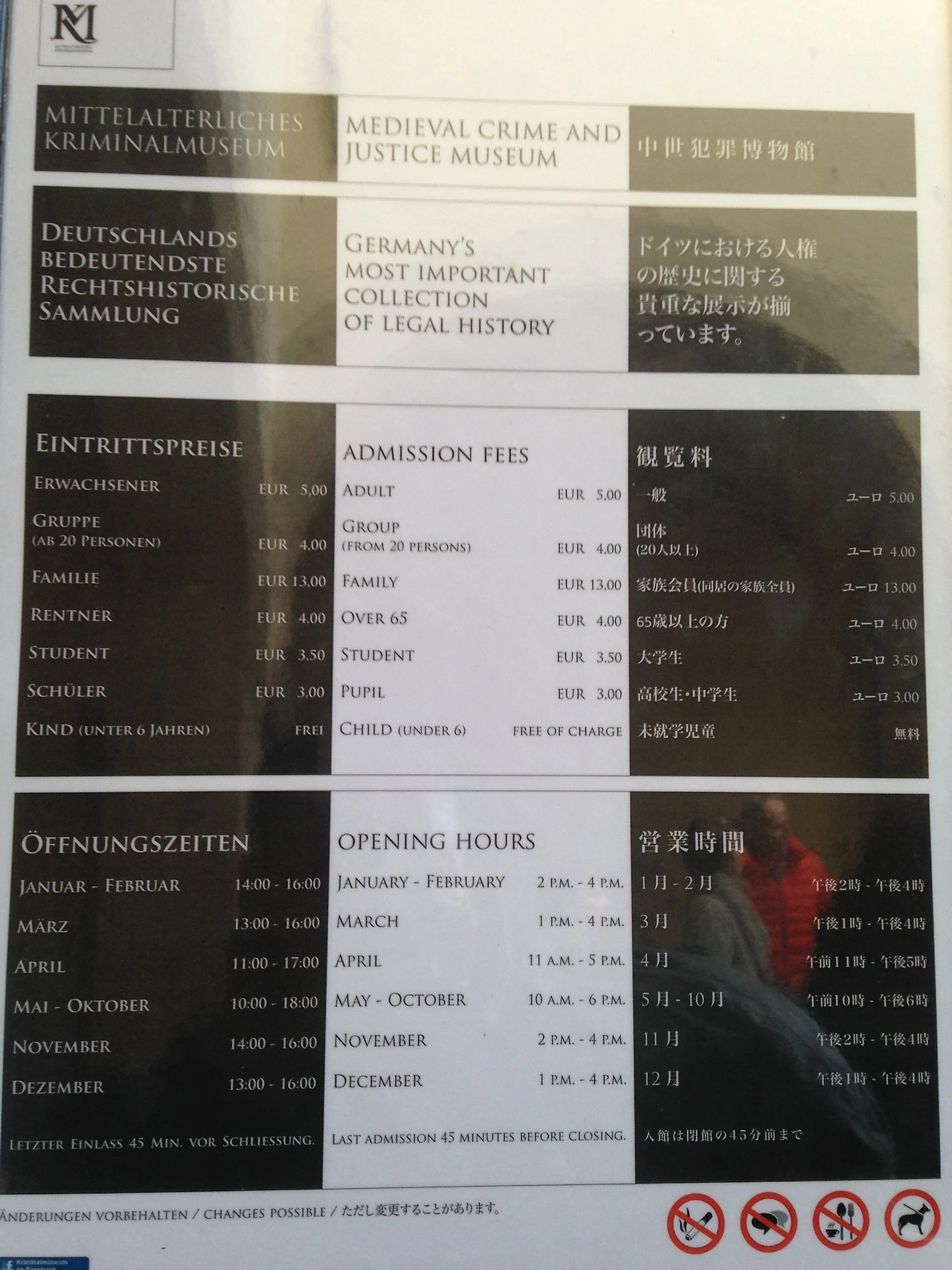 범죄박물관은 지하에서부터 3층까지 중세시대의 각종 고문기구와 어떠한 죄를 저질렀을 때 어떤 처벌을 했는지에 대해 설명해 놓았다. 때로는 모욕을 주기 위한 처벌도 있었고 지금은 이해하기 힘든 죄를 처벌하는 내용도 있어 생각보다 볼거리가 있었다. 사진 촬영은 박물관이다 보니 금지되어 있어 사진을 찍지는 못했다. 역사에 관심이 있거나 중세시대의 생활을 이해하는 데는 좋은 경험이 될 수 있을 것 같았다.