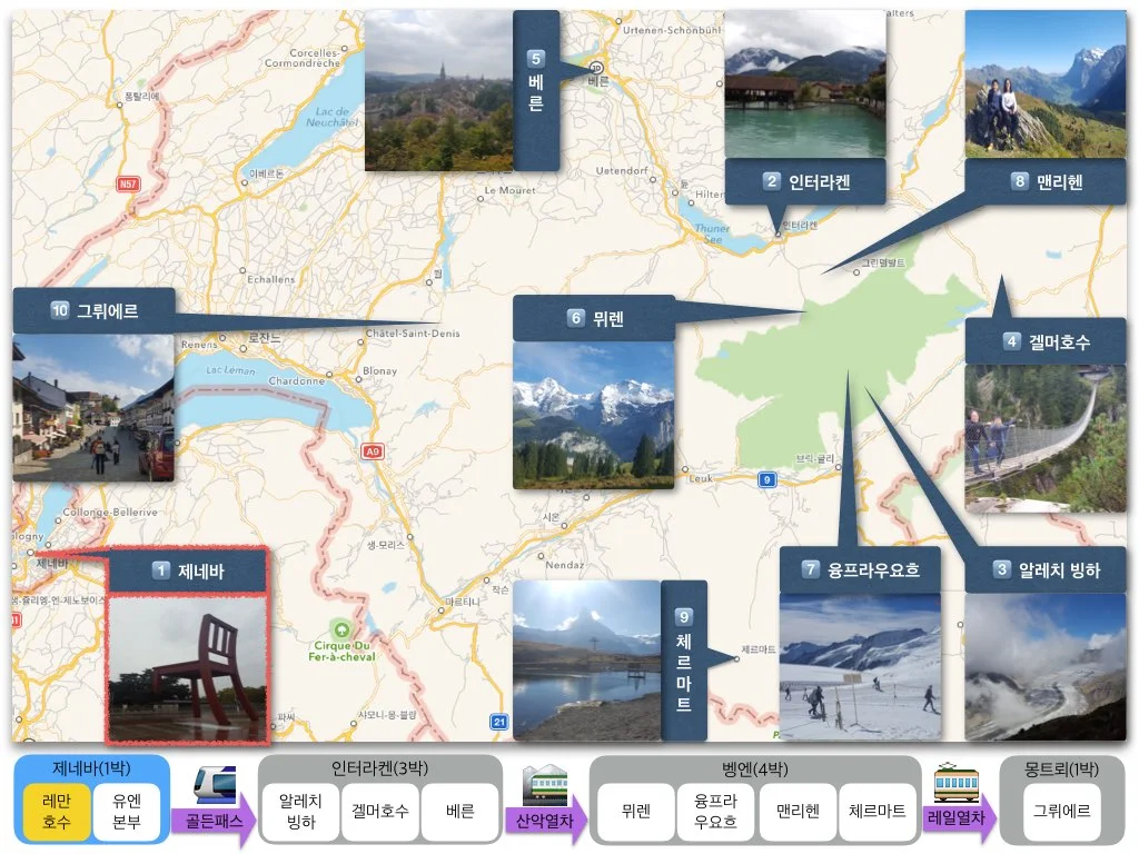 또한 스위스는 세계적으로 상위권을 다투는 관광지인 만큼 여행 장소도 다양하고 경이로운 자연경관도 많아 여러 번 방문해도 언제나 여행의 즐거움을 느낄 수 있음을 확신하고 있었다. 우린 스위스 여행에서 빼놓을 수 없는 융프라우 지역과 다시 방문하게 되면 꼭 가보고 싶었던 알레치 빙하와 겔머호수 등 몇몇 장소를 조합해 10일간의 여행 계획을 세웠다.