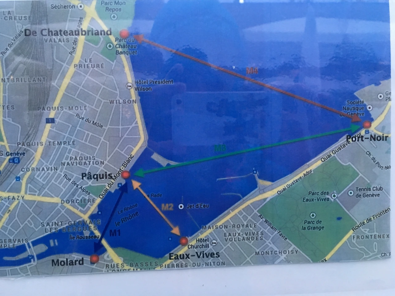 레만호의 보트 택시는 4개의 노선으로 운행된다. 각각의 노선은 M1~M4로 표시되며 정해진 정류소에서 각 노선으로 출발하는 보트 택시의 시간을 확인할 수 있다.