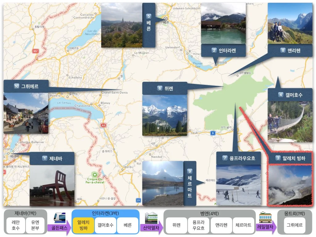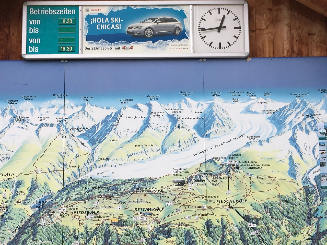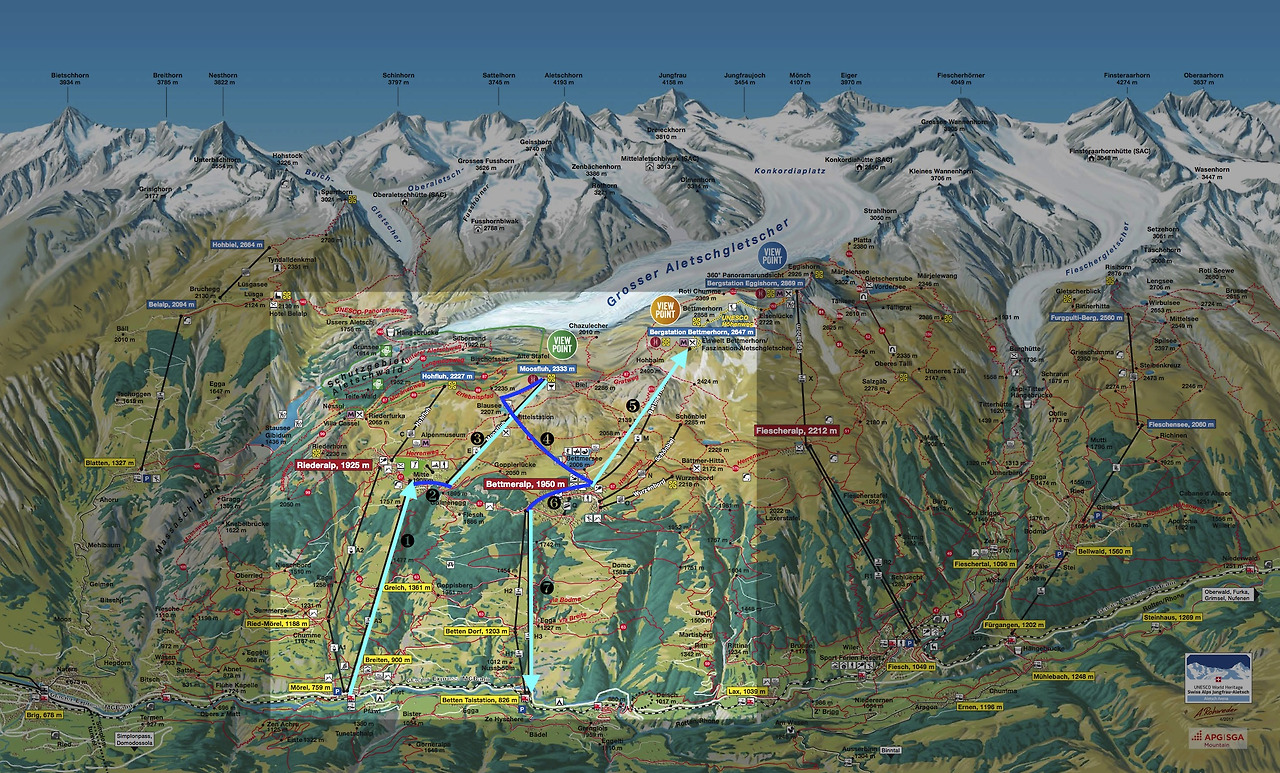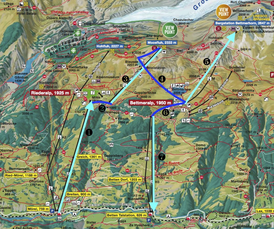 알레치 빙하를 보는 3곳의 View Point는 케이블카를 타고 갈 수 있는데 한 번에 연결되지는 않고 케이블카와 곤돌라를 번갈아 타야 한다. 우린 무스플루(Moosfluh)와 베트머호른(Bettmerhorn) 두 곳의 View Point를 목적지로 정하고 무스플루(Moosfluh)까지는 케이블카와 곤돌라로 이동하고 무스플루(Moosfluh)에서 베트머알프(Bettmeralp)까지 하이킹으로 이동한 후 다시 곤돌라를 타고 베트머호른(Bettmerhorn)까지 올라가는 것으로 결정했다.