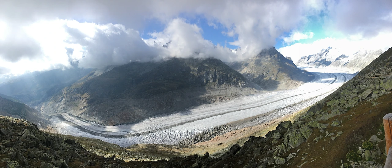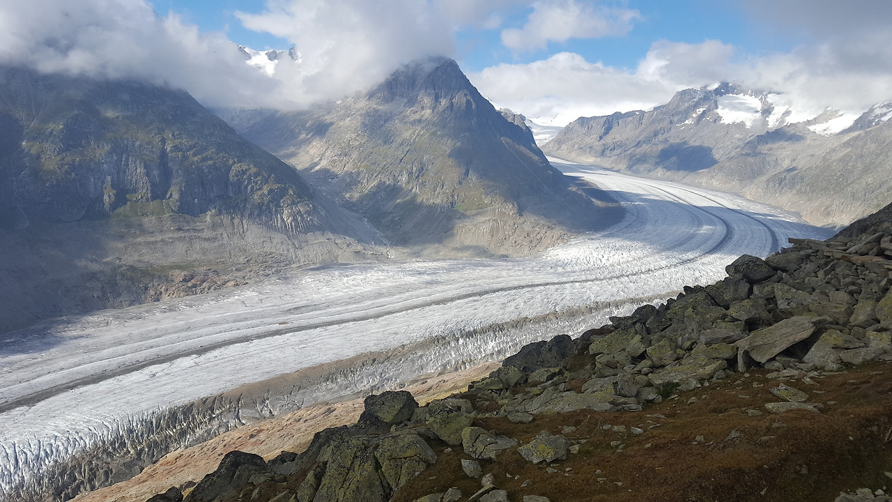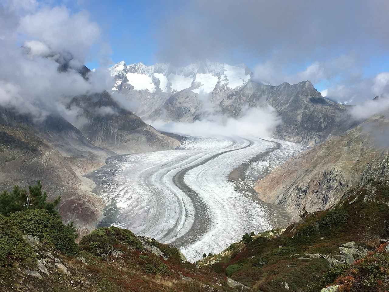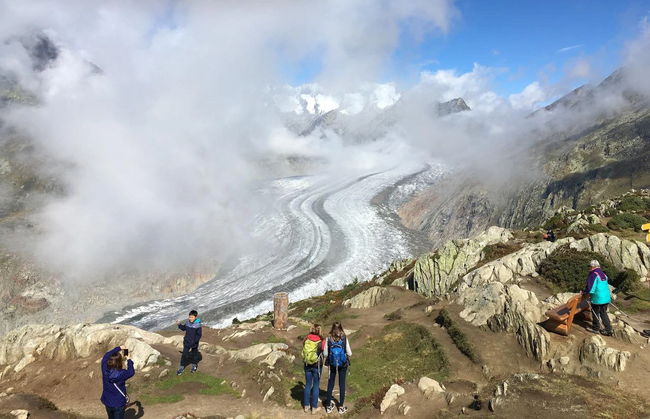 기왕 올라온 거 사진이라도 남기자며 사진만 찍고 일어나려던 찰나 안개가 조금씩 걷히더니 잠시 후 아무것도 보이지 않던 곳에 우리가 기다리던 빙하가 나타나기 시작했다. 안개가 걷히기 시작하자 쌀쌀했던 날씨도 누그러져 우린 빙하가 완전히 모습을 드러낼 때까지 샌드위치와 과일 등으로 점심을 해결하며 기다렸다. 그리고 마침내 알프스 침봉과 함께 모습을 드러낸 알레치 빙하는 거대한 규모와 함께 경이로운 풍경을 뽐냈다.