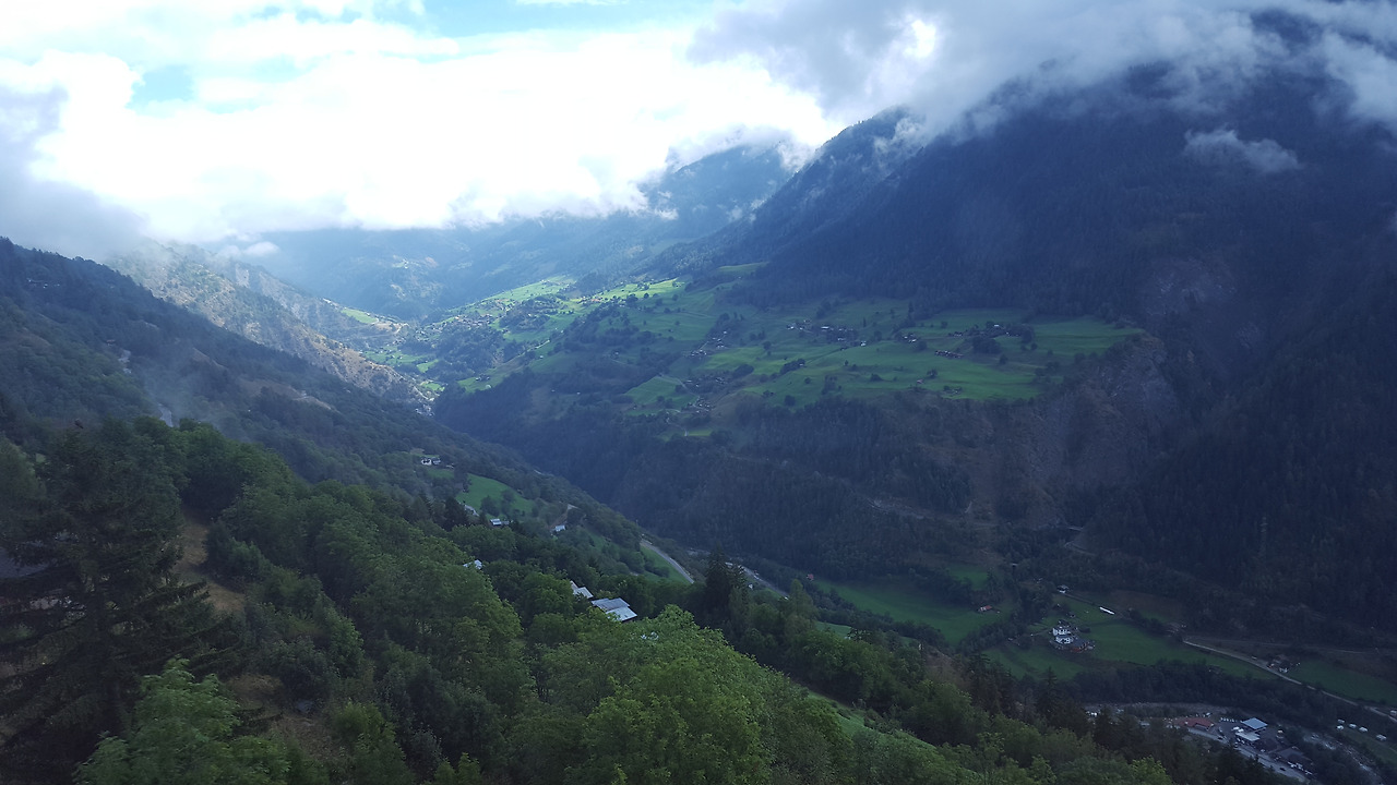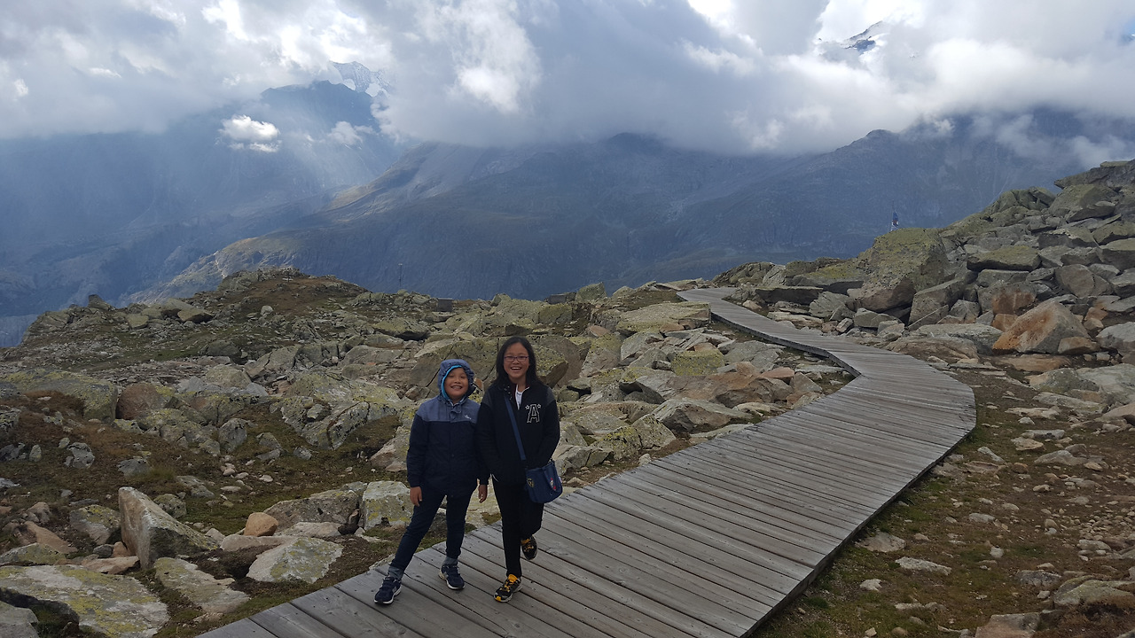 무스플루를 뒤로하고 내려가면 멀리 마터호른과 인근의 산군이 보인다. 무스플루에서 전망대에 설치된 망원경을 통해 4천 미터가 넘는 마터호른과 그 주변의 각 침봉들을 확인할 수 있지만 아쉽게도 아직 구름이 걷히지 않아 일부만 보였다. 하지만 날씨가 맑으면 마터호른을 포함해 만년설을 품은 산군들을 모두 볼 수 있다.