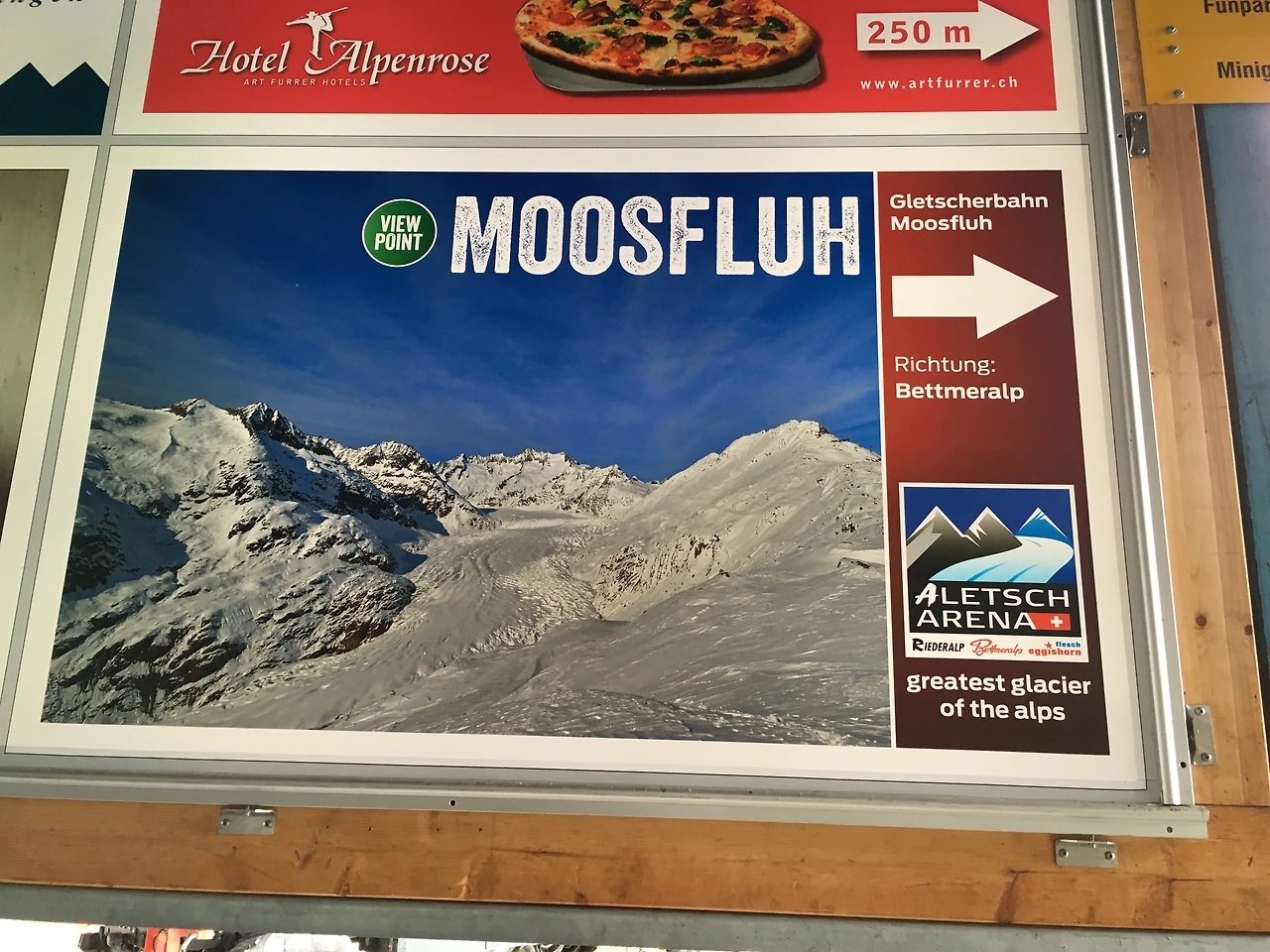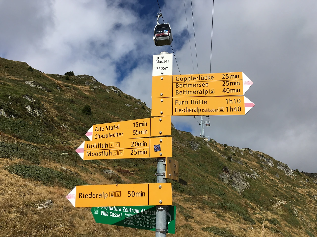 리더알프 미테(Riederalp Mitte)에 도착해 밖으로 나오면 무스플루 방향으로 가는 표시판이 보인다. 무스플루로 가려면 곤돌라를 타고 가야 하기 때문에 화살표가 가리키는 방향을 따라 곤돌라 탑승장까지 이동했다.