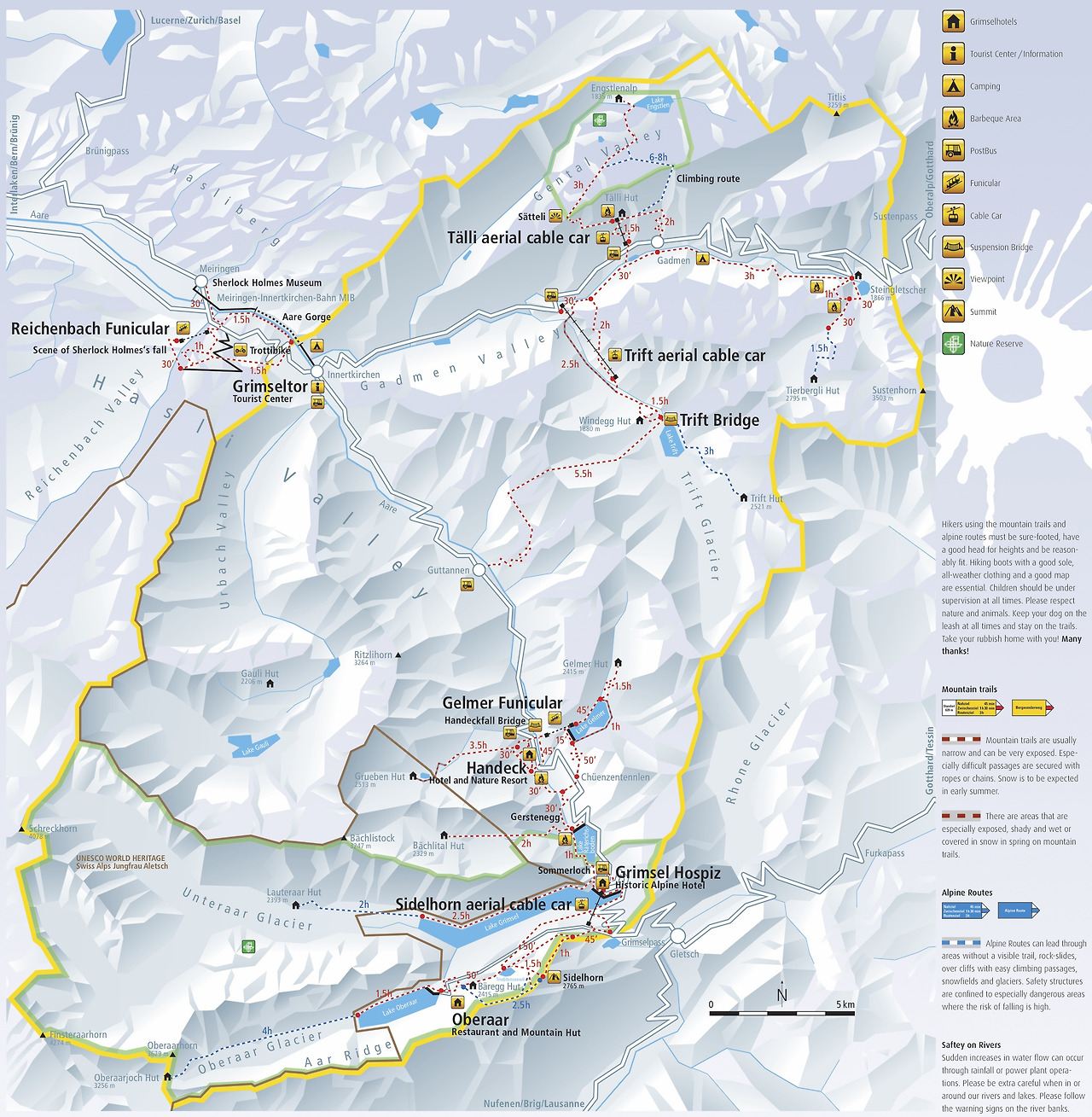 그림젤발트는 인터라켄에서 약 1시간 거리에 있는 마이링겐에서부터 드라이브코스로 유명한 그림젤패스까지 아레강을 따라 넓게 펼쳐져 있는 협곡을 여행하기 위한 이동수단(푸니큘라와 케이블카 등), 발전소 투어, 숙소 등을 모두 포함하고 있다고 보면 된다.