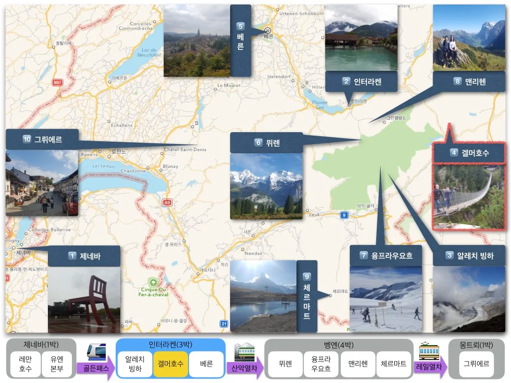버스를 타고 이동하면서 창밖으로 보이는 경치는 스위스라는 브랜드의 가치를 느끼기에 충분했다. 짙은 침엽수림과 연녹색의 초원 그리고 회색의 돌산과 간간이 보이는 흰색의 만년설은 서로 조합되어 너무나도 멋진 풍경을 자아내고 있어 버스가 조금 더 천천히 갔으면 하는 생각이 들기도 했다.