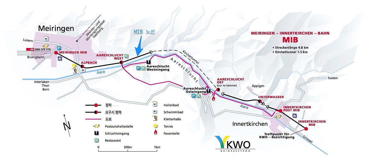 아레협곡을 가기 위해서는 MIB(Meiringen-Innertkirchen-Bahn)를 이용해야 한다. 우린 MIB를 타기 위해 겔머호수를 내려와 버스를 타고 다시 Grimseltor로 돌아왔다.