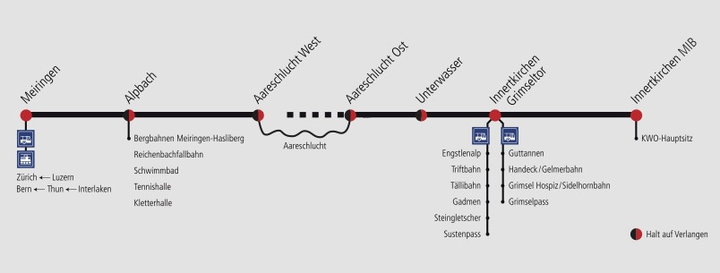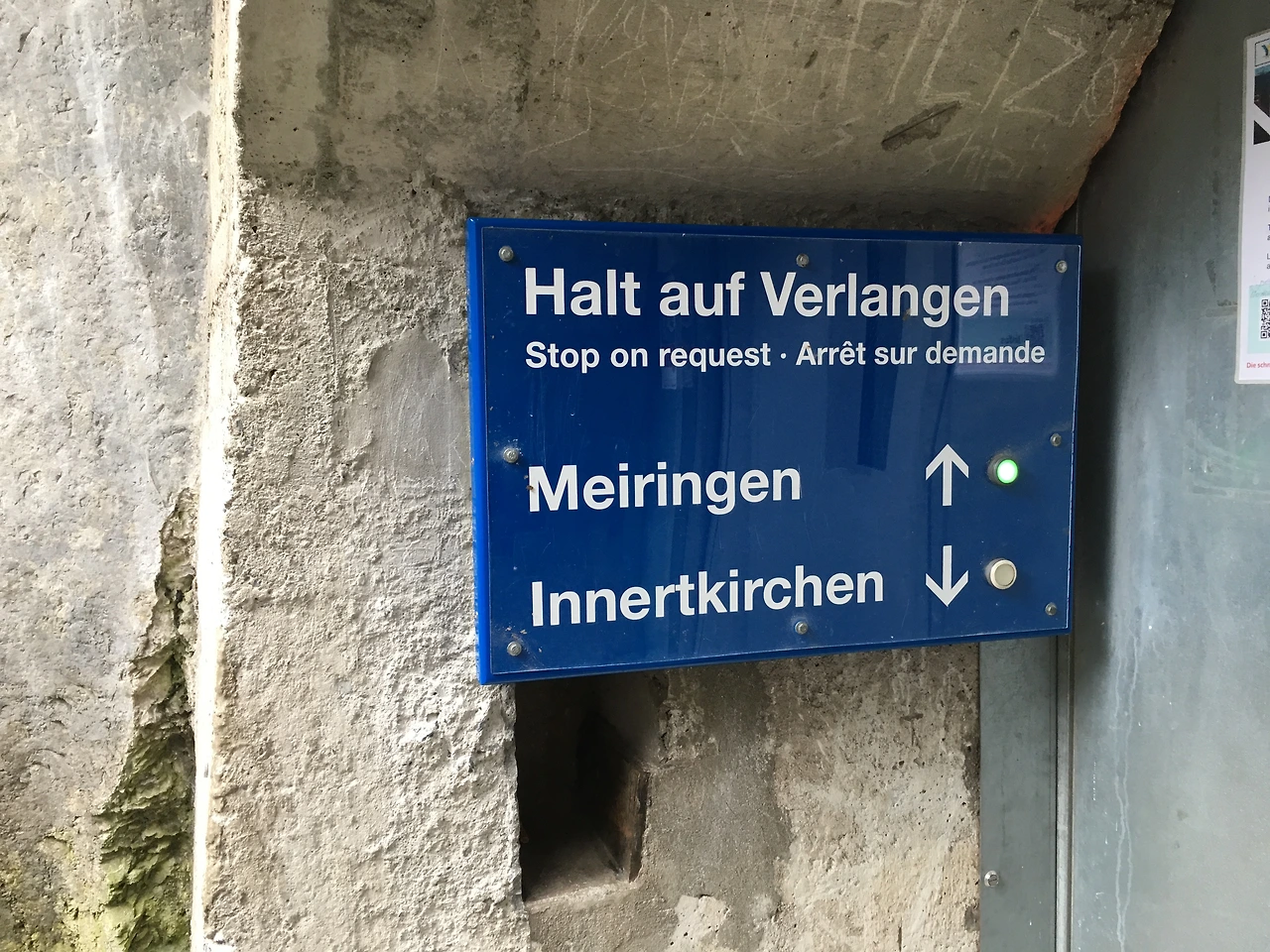 아레슐츠 동역과 서역은 모두 열차 내에 있는 하차벨을 눌러야만 기차가 정차한다. MIB는 종점인 마이링겐역과 이너트키르헨역, 그리고 Grimseltor 역을 제외한 나머지 4개 역은 모두 하차벨을 눌러야만 정차하는 역이므로 내릴 곳을 잘 확인해야 한다.