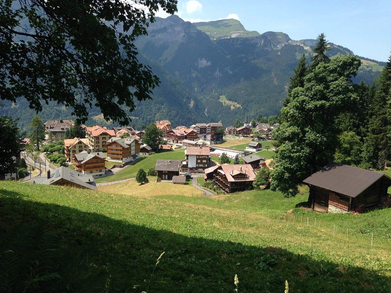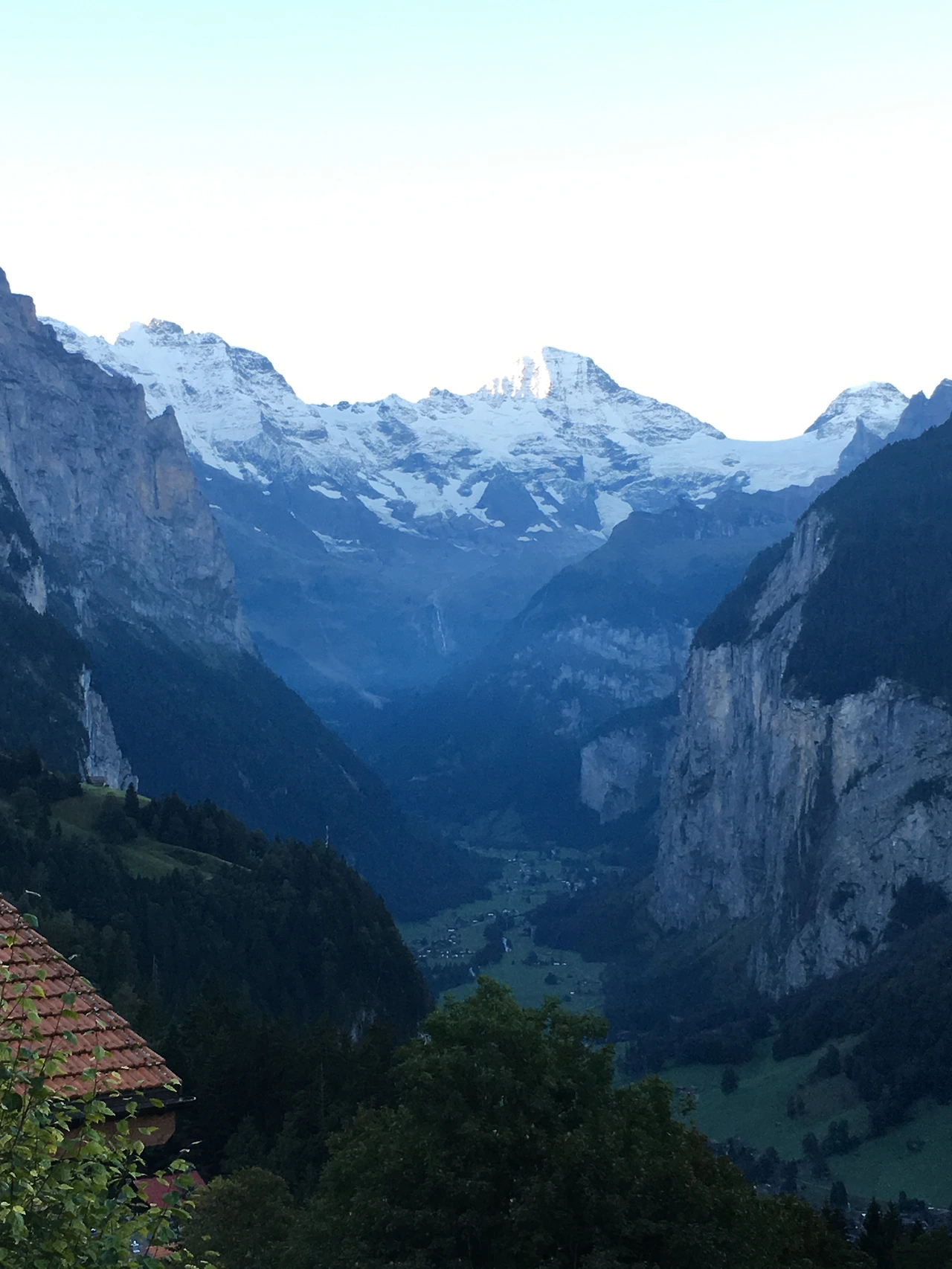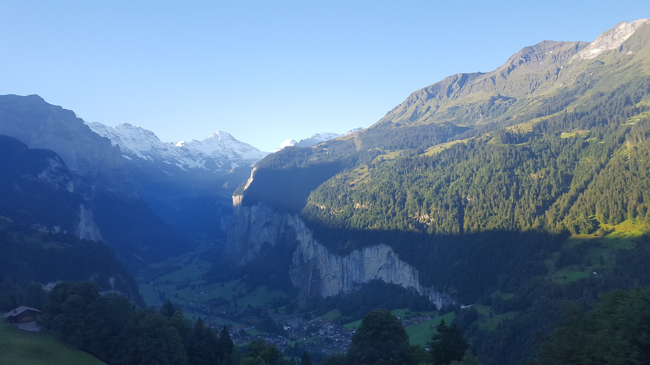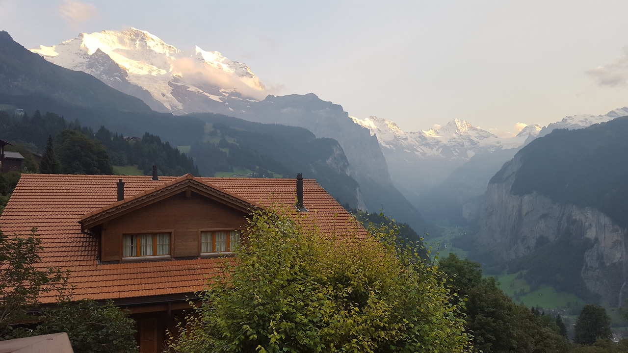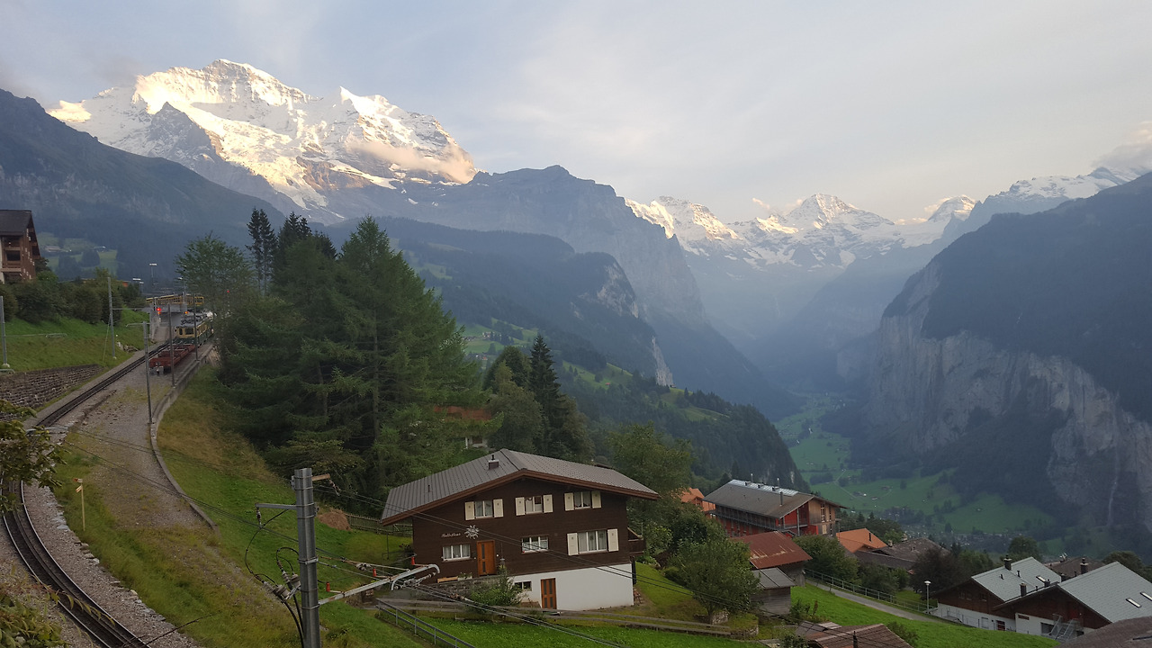 아침에 일어나서 가장 먼저 떠오른 생각은 숙소를 벵엔으로 잡길 잘했다는 것이었다. 전날 밤에 도착했을 땐 아무것도 보이지 않아 풍경을 예상할 수 없었지만 아침에 테라스에서 바라본 풍경은 말로 표현하기 힘든 감동이었다. 계곡에 자리 잡은 라우터브루넨 마을과 계곡 끝에 보이는 설산은 웅장함과 경이로움을 가득 안겨주며 테라스에서 한참 동안 발을 떼지 못했다.