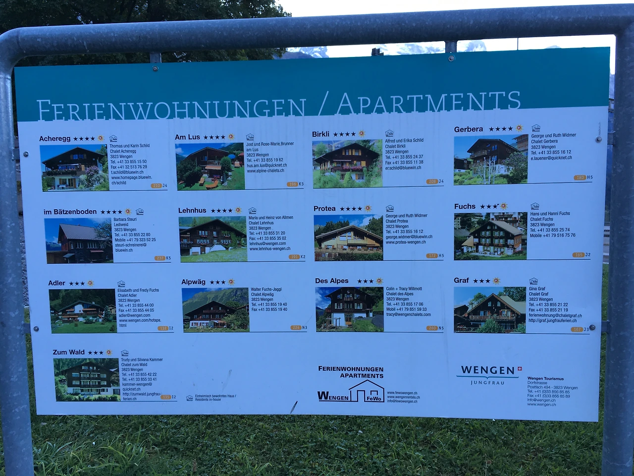 벵엔역 앞에는 벵엔지역의 숙소를 안내하는 안내판이 있다. 아마도 미리 숙소를 예약하지 않고 오는 사람들을 위해 만들어둔 곳이 아닐까 싶었다. 우리가 머물고 있는 숙소도 안내되어 있었는데 우리가 머문 숙소는 숙박공유사이트에서 꽤나 높은 점수를 받은 숙소였다. 시설도 좋았지만 테라스에서의 풍경이 큰 영향을 끼쳤을 거란 생각이 들었다.^^