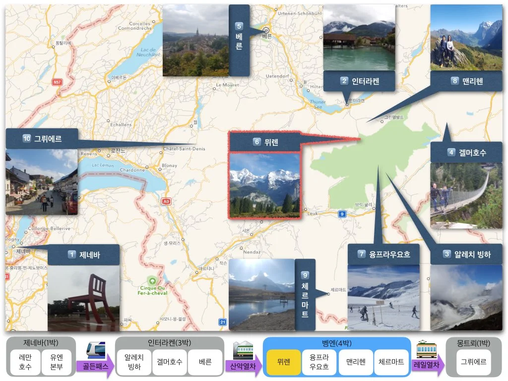 우린 융프라우 지역에서의 첫째 날 여행은 스위스 패스로 열차와 케이블카 이용이 가능한 쉬니케플라테와 뮈렌으로 결정했다. 그리고 융프라우요흐와 멘리헨을 둘째 날과 셋째 날 여행지로 정하고 융프라우 VIP 패스를 이용해 이동하기로 계획을 세웠다.