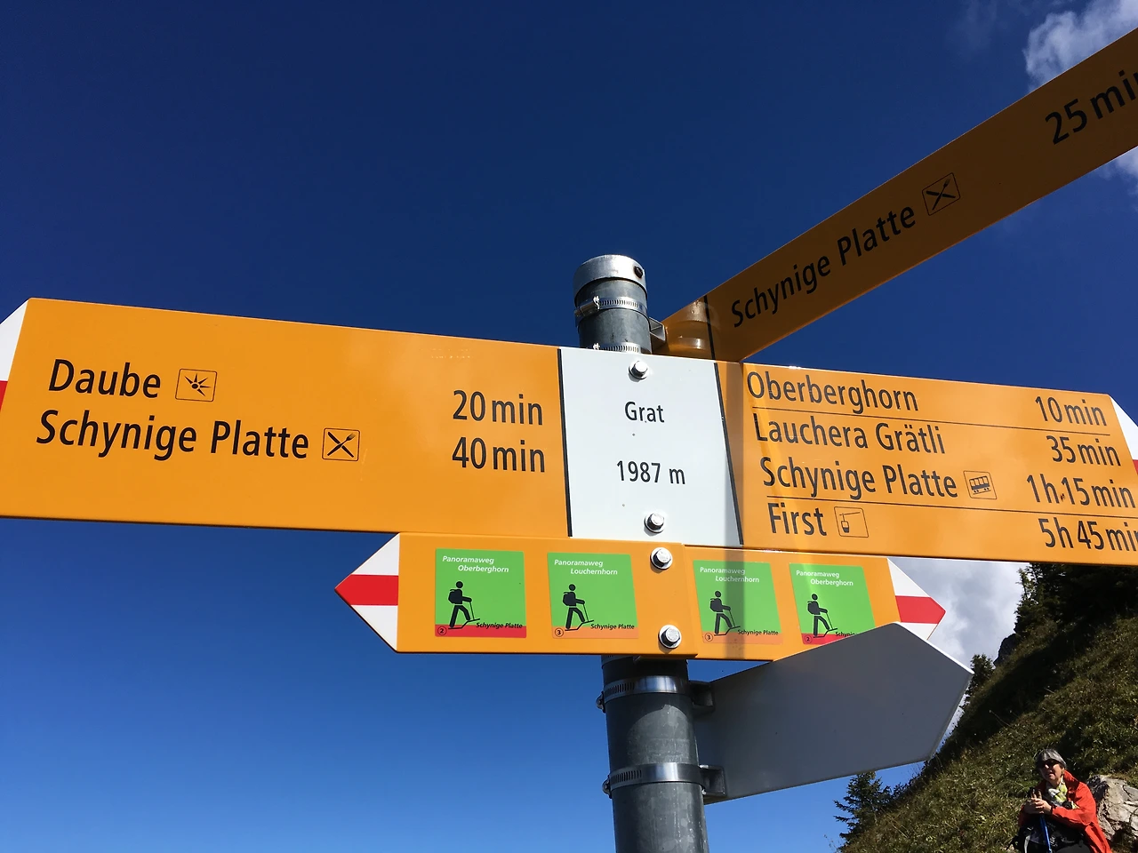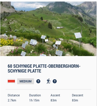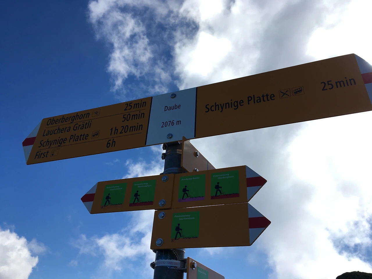 60번 코스는 쉬니케 플라테 역에서 출발해 2개의 작은 봉우리인 다우브와 오버베르그호른을 거쳐 쉬니케 플라테 역으로 되돌아오는 코스이다. 하이킹 시간은 약 1시간 30분 정도의 시간이 소요되는데 우린 사진을 찍으며 여유롭게 이동하다 보니 2시간을 훌쩍 넘긴 듯하다. 난이도는 중급자 코스로 되어 있는데 운동화만 신으면 무난하게 갈 수 있는 코스이다. 약간의 오르막이 있지만 크게 어렵게 느낄 정도는 아니다.