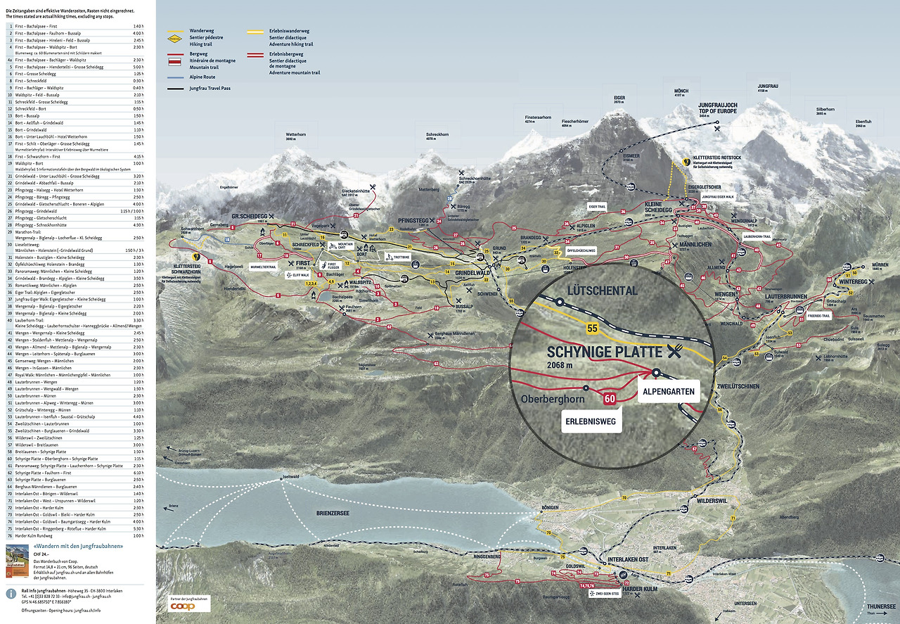 쉬니케 플라테는 브리엔츠 호수를 따라 병풍처럼 펼쳐진 해발 2,000m 산 위에 위치해 있기 때문에 한쪽으로는 넓게 펼쳐진 호수의 풍경을 그리고 반대편으로는 아이거, 묀히, 융프라우를 비롯한 4,000m의 봉우리들이 흰색의 만년설 모자를 쓴 모습을 만날 수 있는데, 이점이 쉬니케 플라테의 가장 큰 장점일 듯하다. 어쩌면 이런 풍경을 보며 하이킹을 하면 시간이 지체되는 것은 당연하지 않을까?