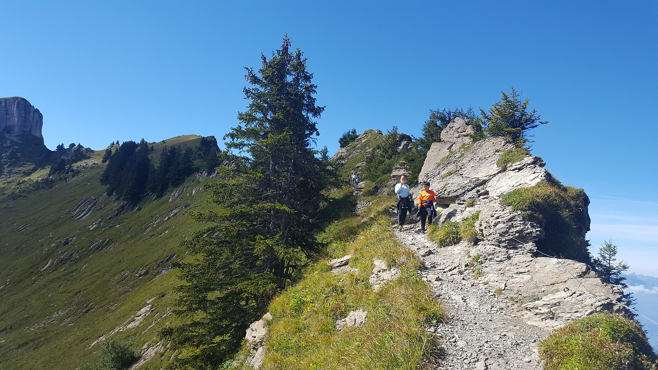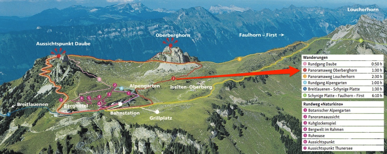 오버베르그호른에 오르면 다우브에서부터 산 능선을 따라 걸어온 길이 한눈에 보인다. 다우브를 거치지 않고 쉬니케 플라테 역에서 바로 오버베르그호른으로 오는 길도 능선 아래쪽으로 보인다. 아마도 짧은 시간 하이킹을 하는 사람들을 위한 길인 듯하다. 기왕이면 다홍치마라고 조금 힘들 수도 있지만 호수 쪽 멋진 경치를 감상할 수 있는 산능성 길이 좀 더 재미있는 하이킹을 할 수 있을 것 같다.