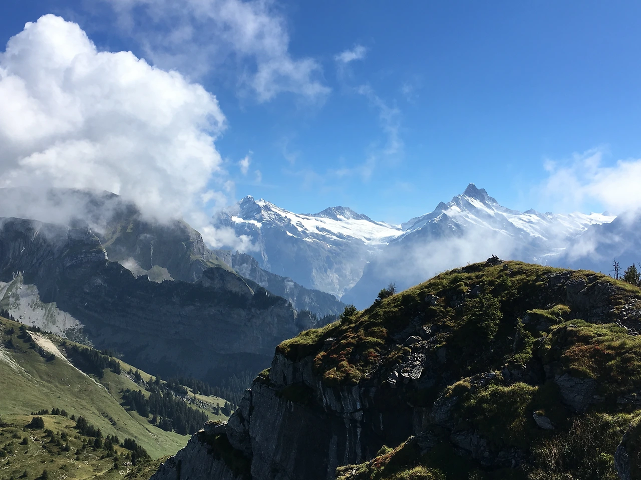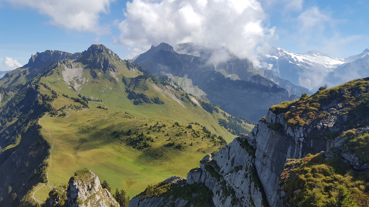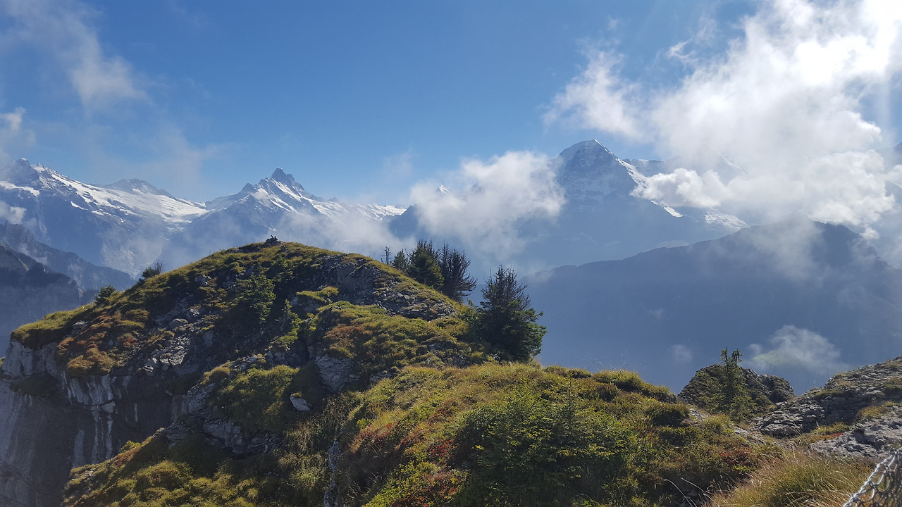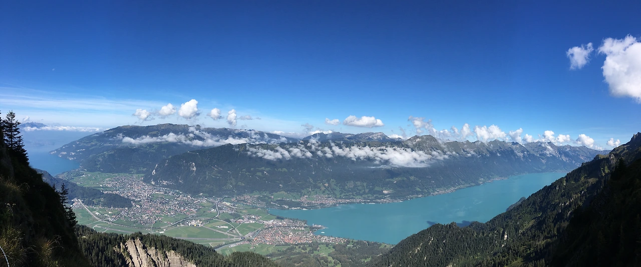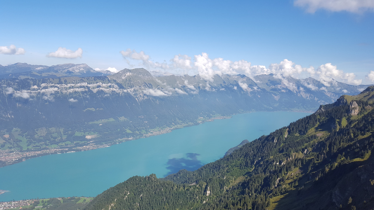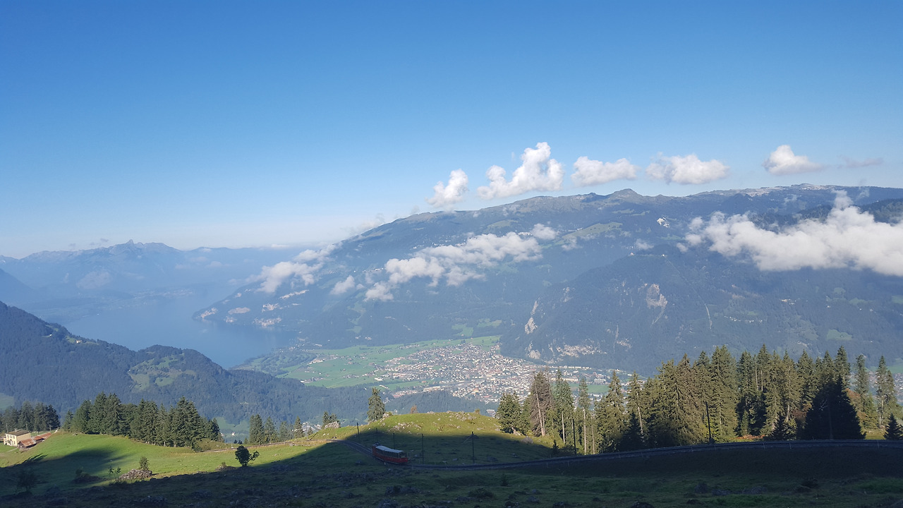 고도가 올라가면 인터라켄을 가운데 두고 튠 호수와 브리엔츠 호수가 숲 사이로 간간이 모습을 드러내 정상에서 보게 될 풍경에 기대를 갖게 한다. 마침 구름이 눈높이에 걸쳐있어 얼마나 높이 올라와 있는지 알려주는 듯하다.