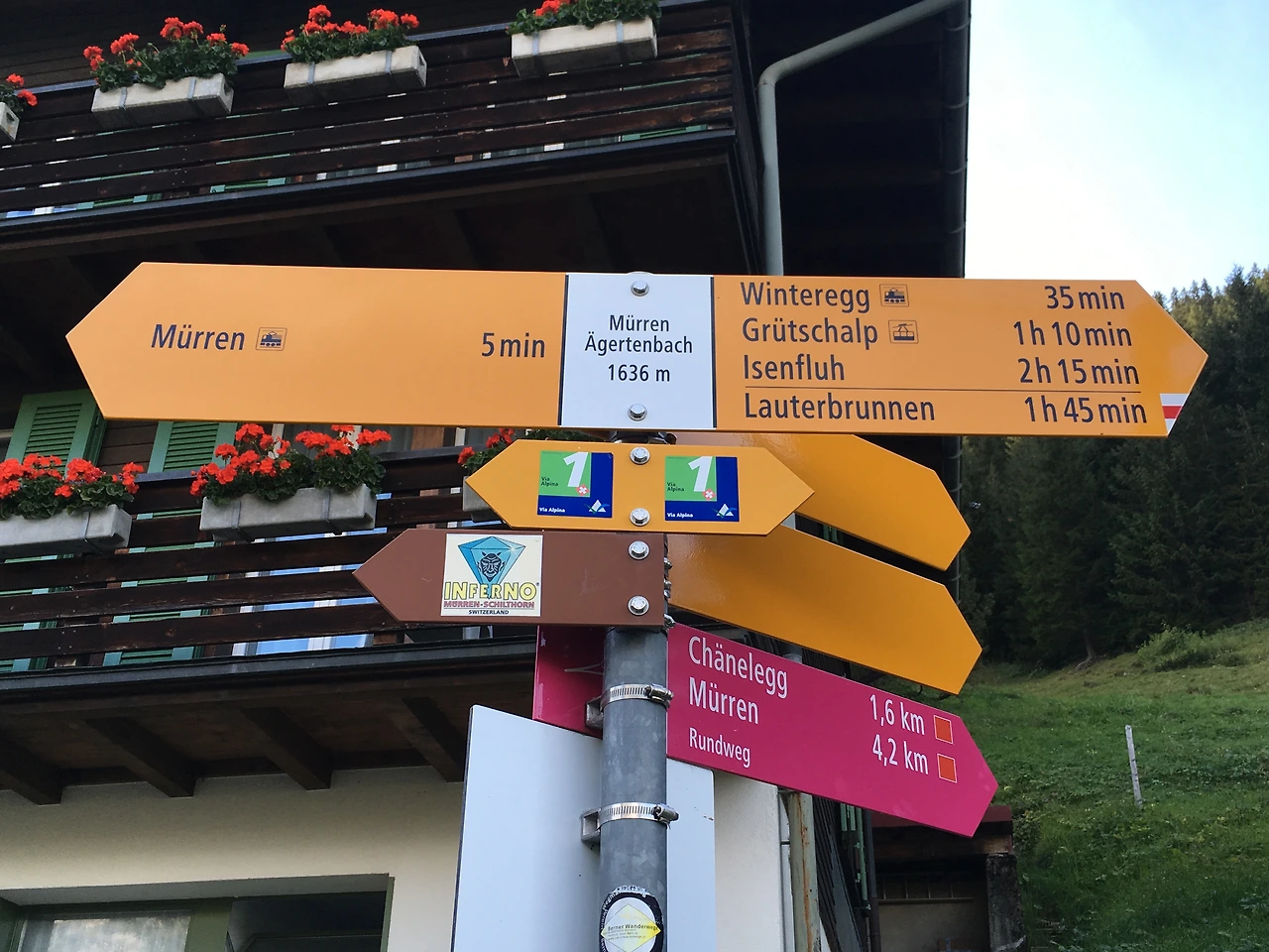 종착역인 뮈렌 역에서 밖으로 나오면 주변 목적지로 가는 방향과 이동시간이 안내되어 있어 방향을 찾는 것이 어렵지 않다. 윈터렉까지는 35분, 그러취알프까지는 1시간 10분이 소요되는 것으로 안내되어 있다.
