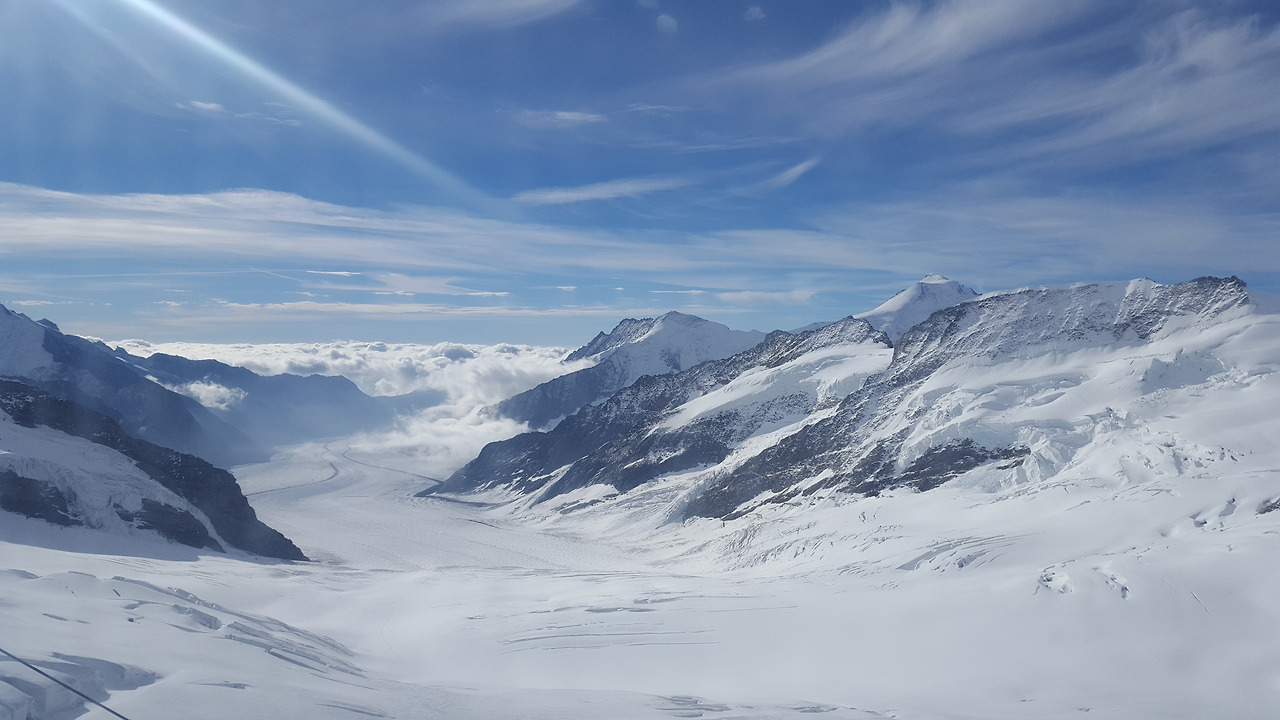 아이거, 묀히와 더불어 알프스의 대표적인 3대 봉우리로 손꼽히는 융프라우는 해발 4,158m 의 높이를 자랑하며, 유네스코 세계자연유산으로 지정된 알레치 빙하가 시작되는 곳이다. 스핑스 전망대에서 바라보면 얼음강처럼 길게 뻗어있는 알레치 빙하를 볼 수 있다.