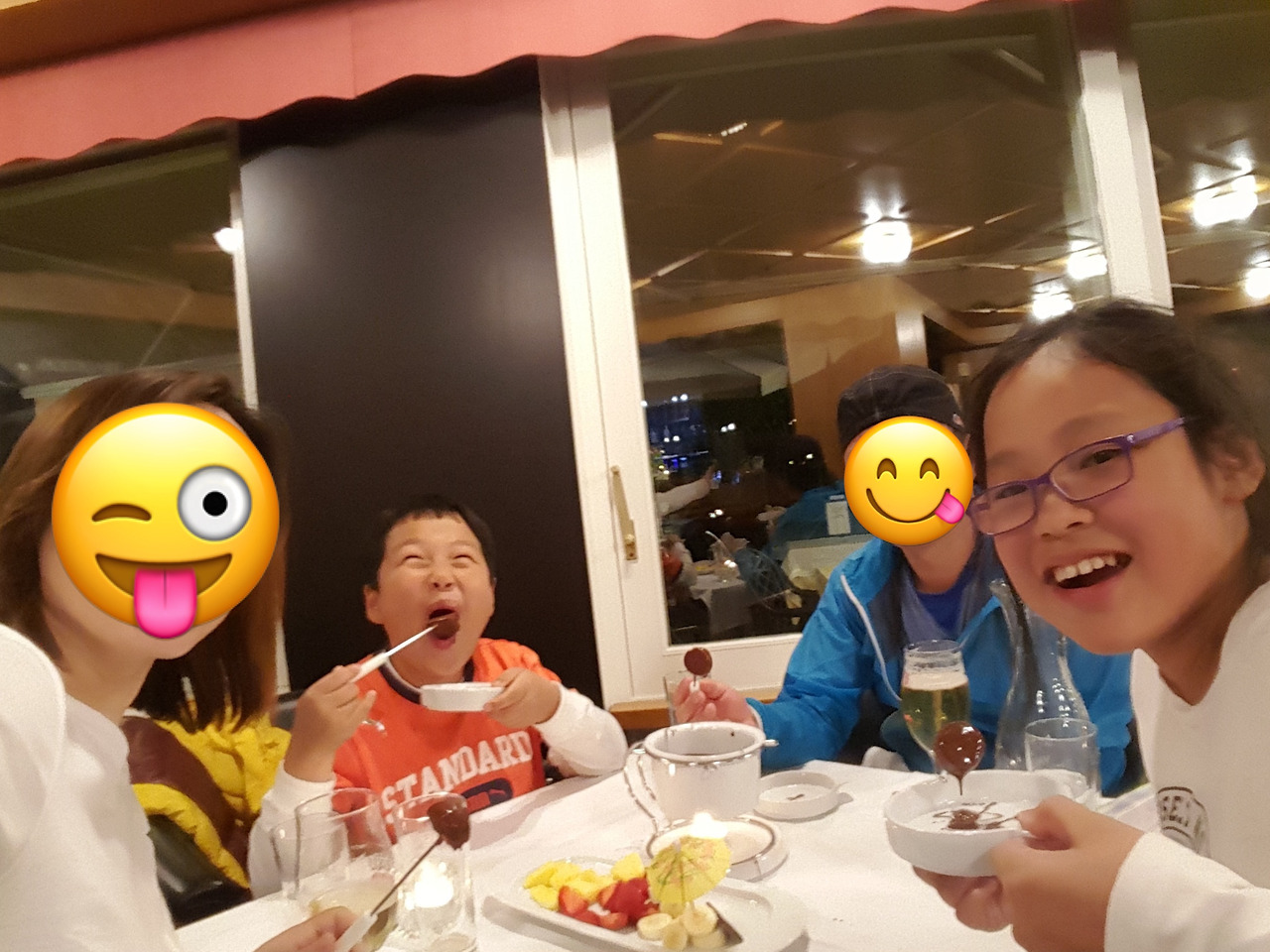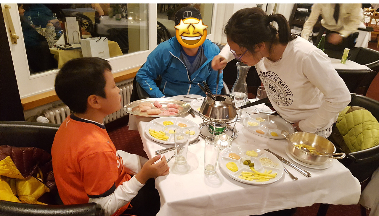우린 메뉴를 주문하면 한국에서처럼 알아서 순서대로 갖다 주는 줄 알고 처음 나온 고기 퐁듀를 먹은 후 계속 기다렸는데도 음식이 안 나오자 웨이터를 불러 물었더니 다 먹었느냐며 다음 음식을 갖다 줘도 되겠느냐며 그제야 물어본다. 그리고 그제야 음식을 준비하는 듯했다.