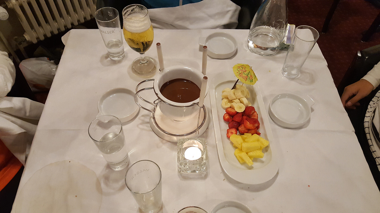 슈 레스토랑은 스위스 전통 레스토랑으로 역사가 깊은 레스토랑이다. 우린 스위스 전통 음식인 퐁듀 세트를 주문했는데 고기, 치즈, 초콜릿 퐁듀가 세트로 나오는 메뉴였다.