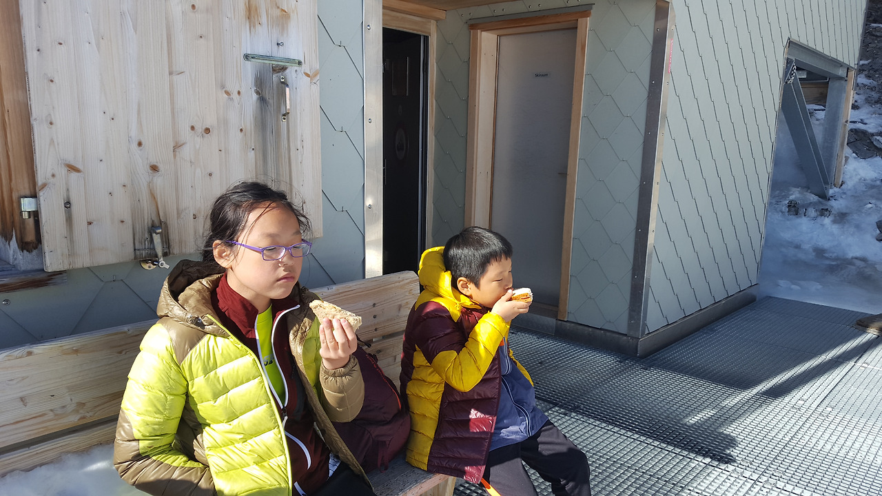 우린 묀히산장 입구에 놓인 벤치에 앉아 준비해온 샌드위치와 빵으로 허기를 채우며 휴식을 취했다. 빵을 먹지 않았으면 우린 움직이지 못했을지도^^;; 영하의 날씨에 차갑게 식은 빵이었지만 지친 체력을 보충하기에는 더없이 달콤한 빵이었다.