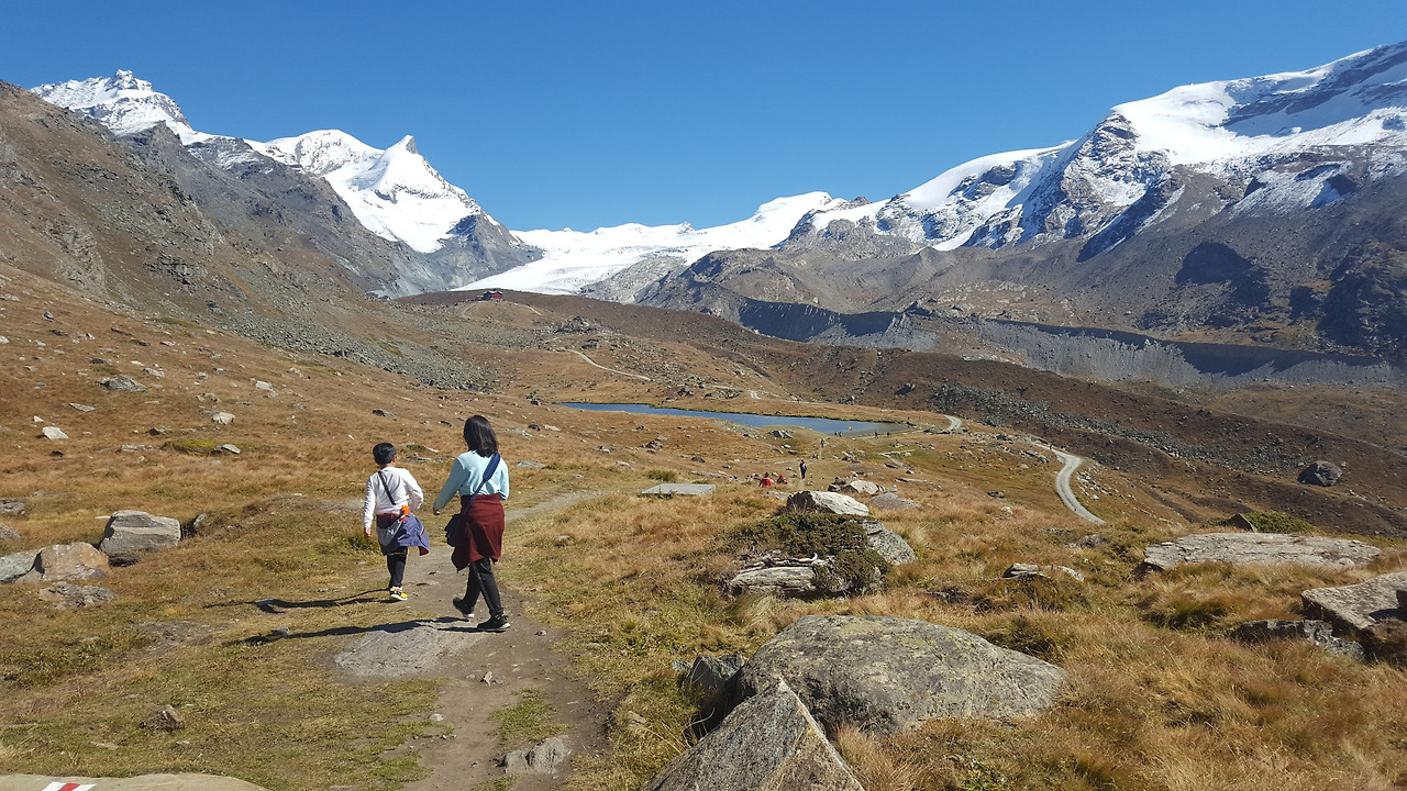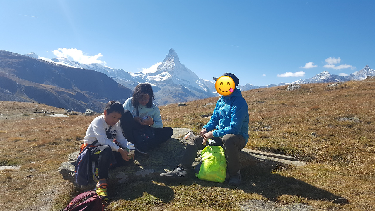슈텔리 호수는 로트호른에서 내려오면서 볼 때는 작아 보였지만 막상 가까이서 보니 생각보다 넓었다. 우린 호수 근처에서 마테호른을 바라보며 가져온 간식으로 점심을 대신했다.