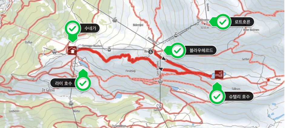 라이 호수에서 조금 더 쉬고 싶었지만 수네가에서 출발하는 푸니쿨라 시간 때문에 떨어지지 않는 발걸음을 억지로 움직여 푸니쿨라를 타고 체르마트로 내려왔다.