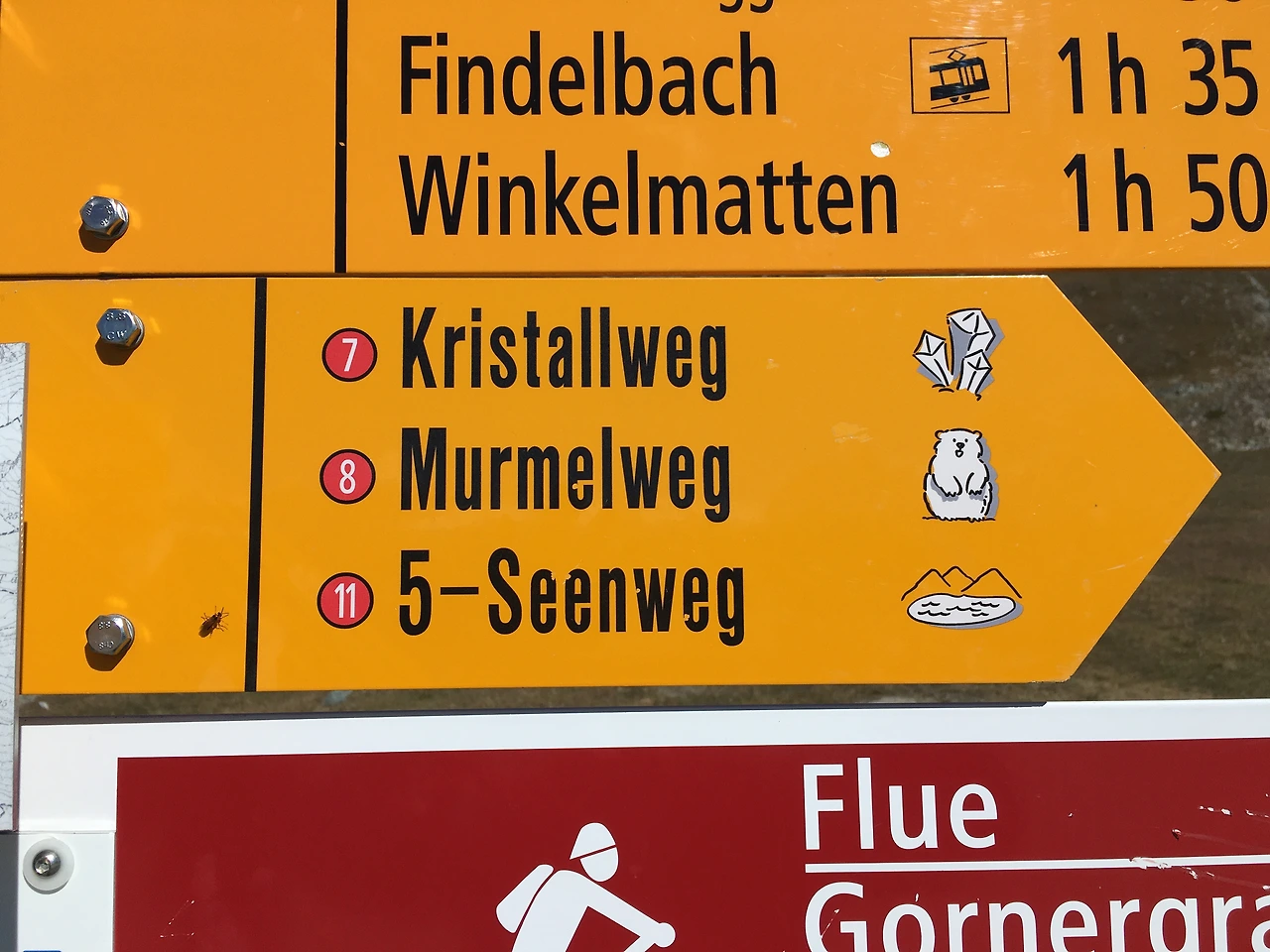 브라우헤르드에 내려 밖으로 나오면 여러 목적지를 안내하는 표지판이 있다. 우린 로트호른에서 느꼈던 황량함으로 인해 5개의 호수길에 대한 기대가 사라진 데다 시간적인 여유가 많지 않아 5개 호수를 모두 돌아보는 것에 대해서는 회의적이었다. 그리고 5개의 호수길(11번 코스)의 대안으로 Murmel길(8번 코스)을 선택하기로 했다.
