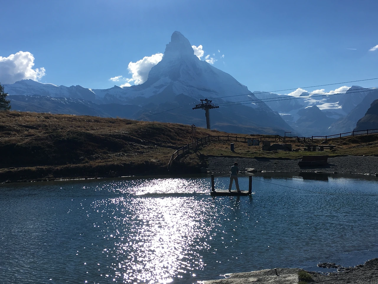 건너편 쪽에 다다르니 많은 사람들이 풍경을 보며 쉬고 있었고, 또 몇몇은 자리를 잡고 사진을 찍고 있어서 이곳이 뷰포인트 임을 확신할 수 있었다. 우리도 다른 사람들처럼 풍경을 즐기기 위해 마테호른을 바라보니 그제야 슈텔리 호수가 왜 유명한지 알 수 있었다.