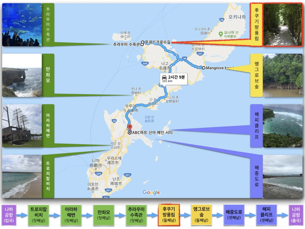 추라우미 수족관 근처에 숙소를 구해 첫날 숙박을 해결한 우린 둘째 날 여행은 전날 폐장시간에 쫓겨 돌아보지 못했던 에메랄드 비치를 잠깐 둘러보는 것으로 시작했다.