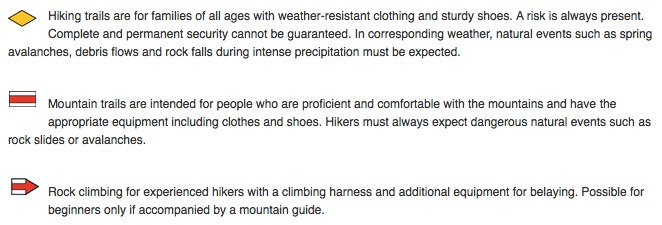 각 하이킹 코스는 가장 쉬운 코스부터 전문가 코스까지 3단계로 나뉘어 있으며 각각의 난이도를 표현하는 그림으로 표시되어 있다. 우리가 선택한 코스는 중간단계 난이도이다. 경험해보니 가장 어려운 단계인 3단계를 제외하고는 일반인이 하이킹을 하기에 큰 무리는 없을 것 같다.